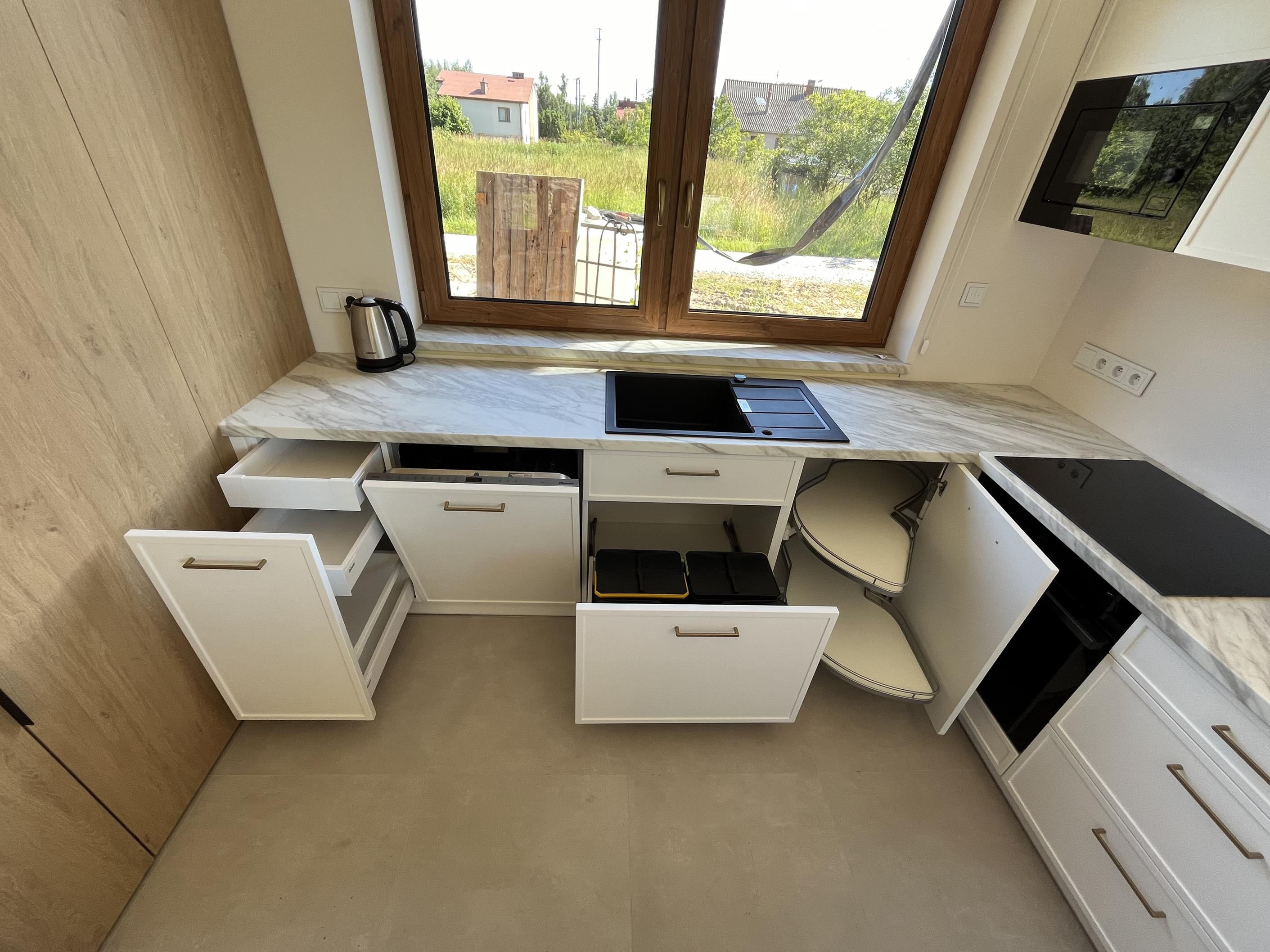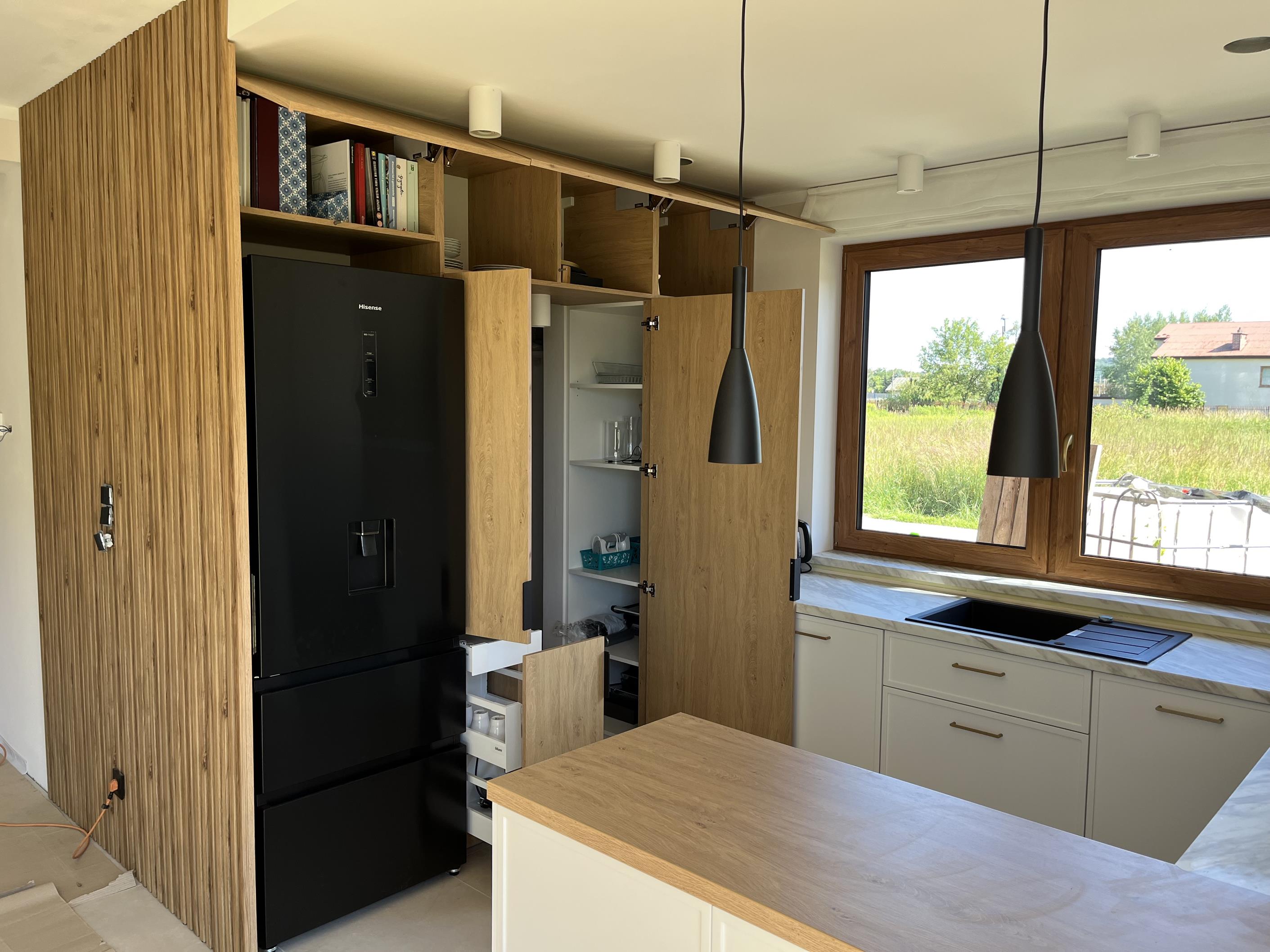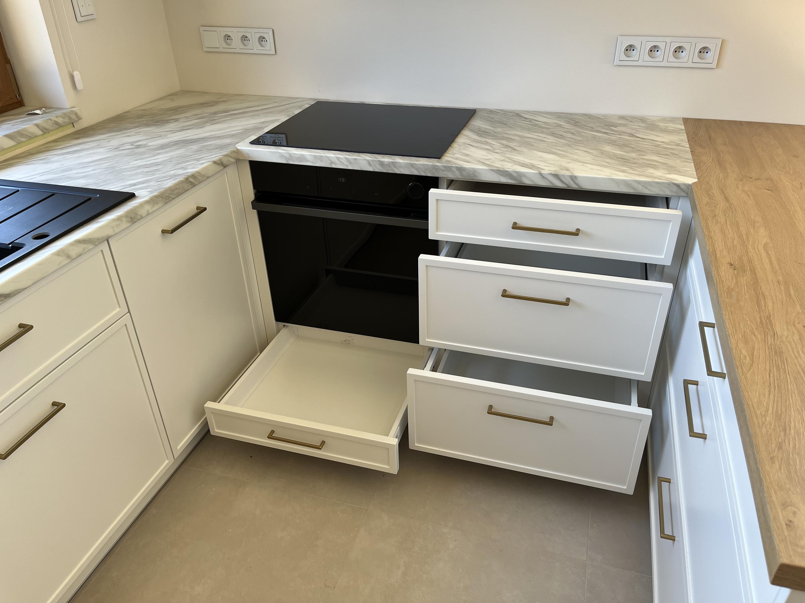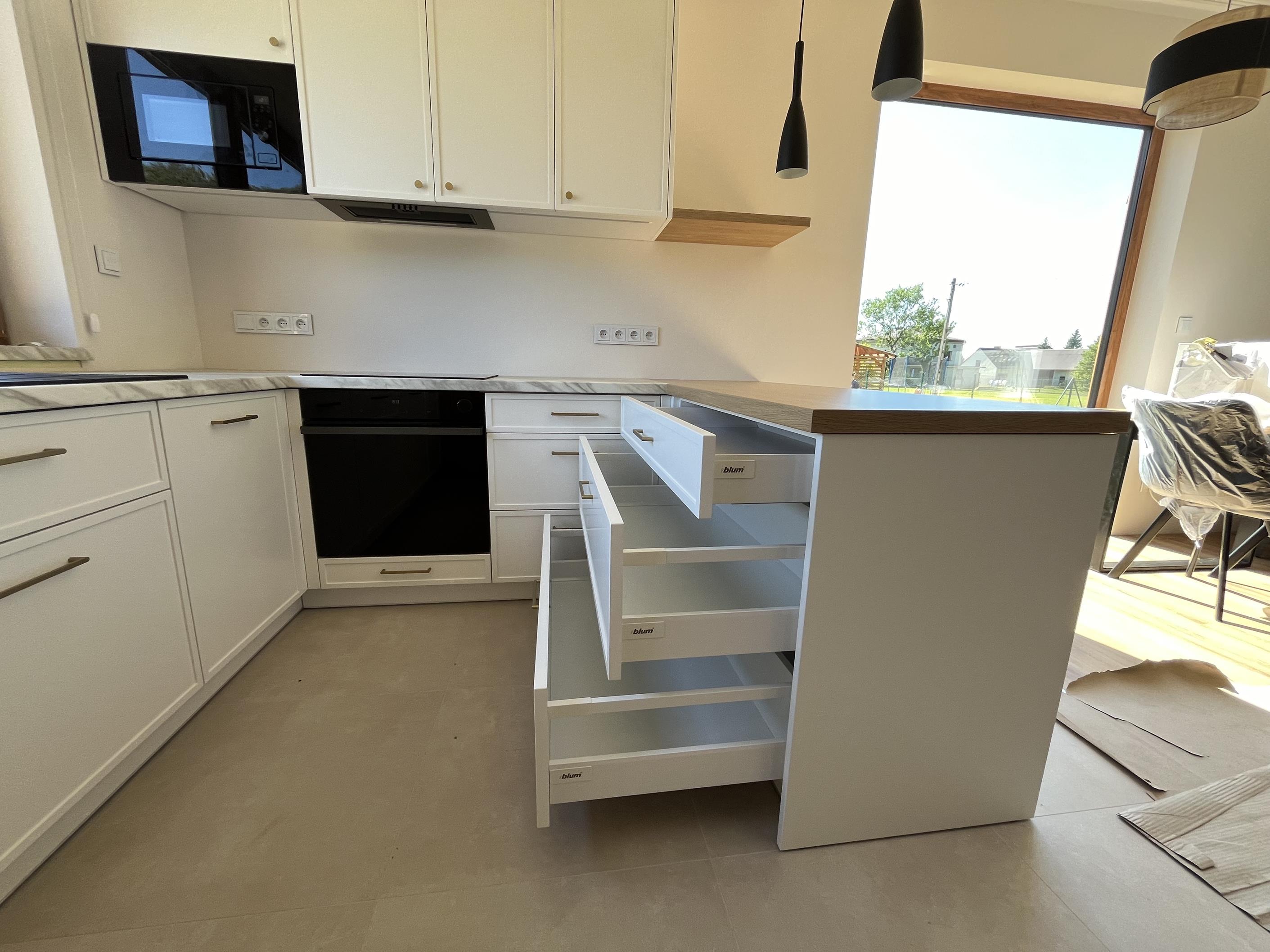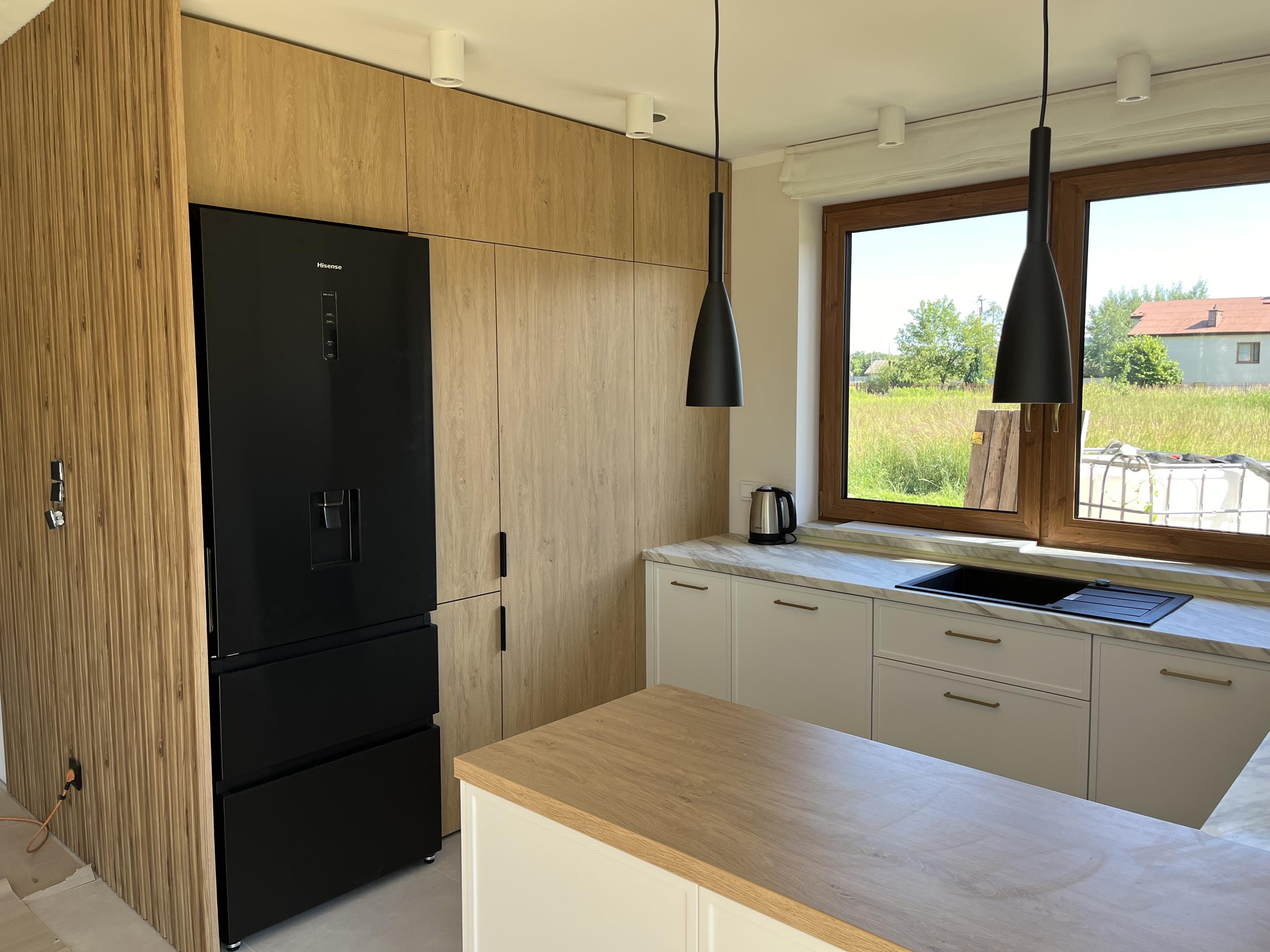 Wysoka zabudowa jest wykonana właśnie z tego dębu kamiennego natomiast pozostałe fronty są frezowane i lakierowane na biały mat.