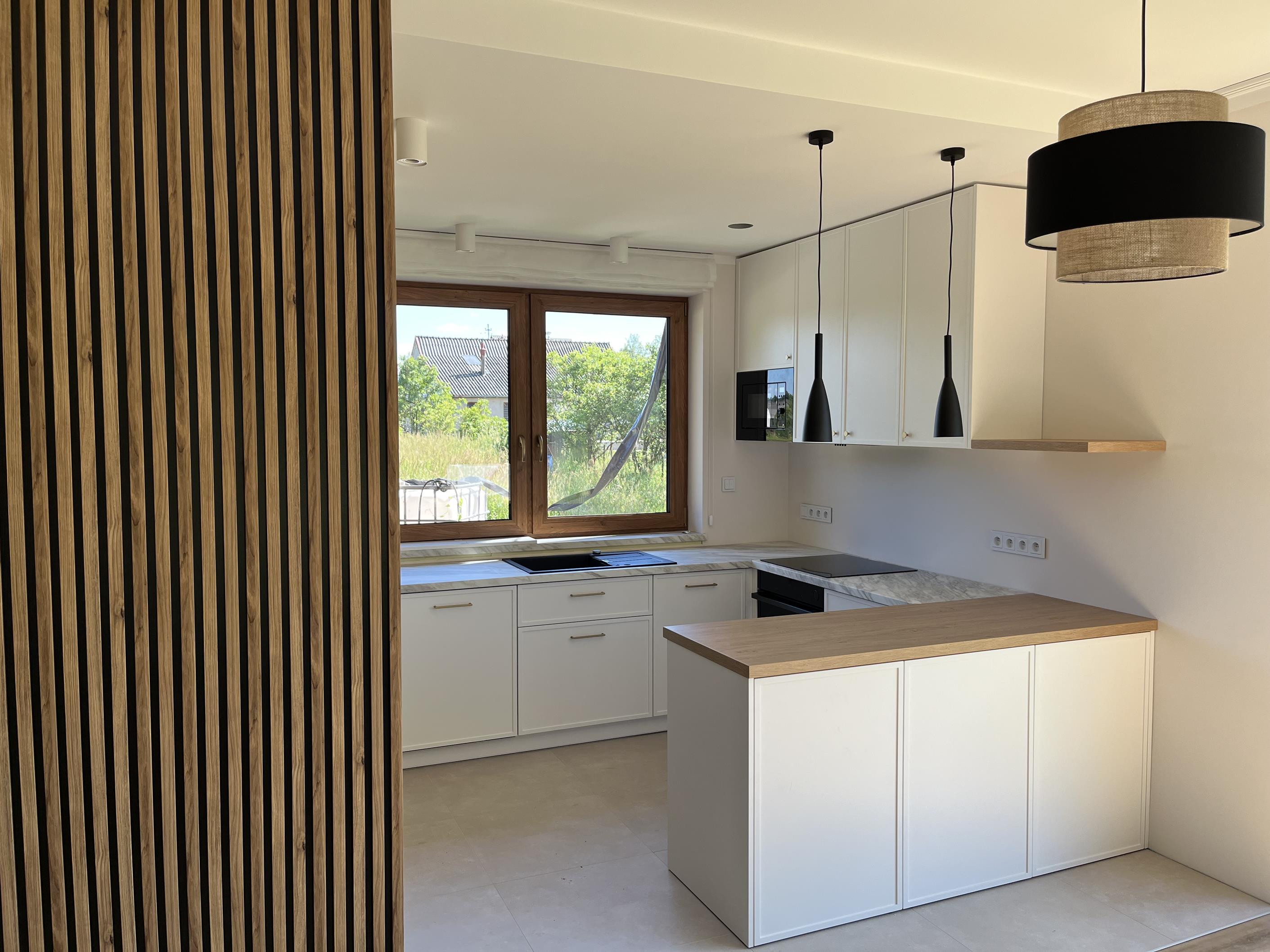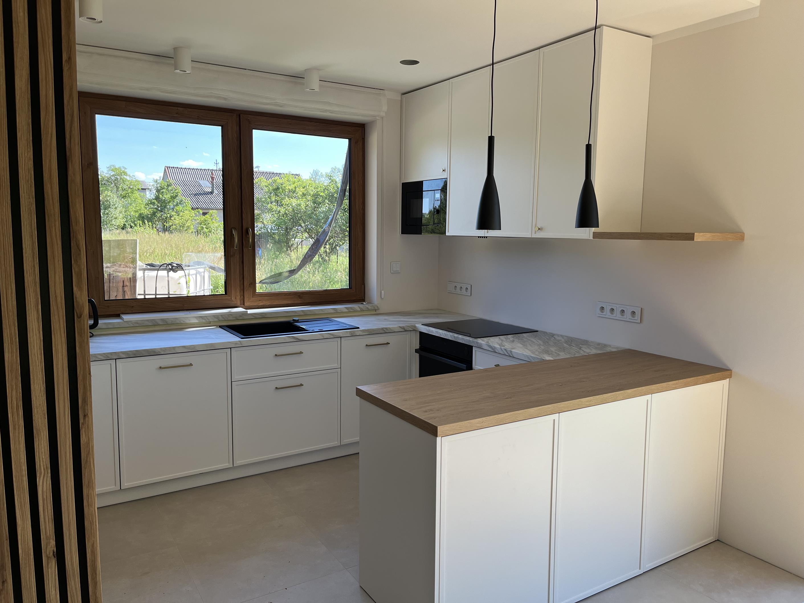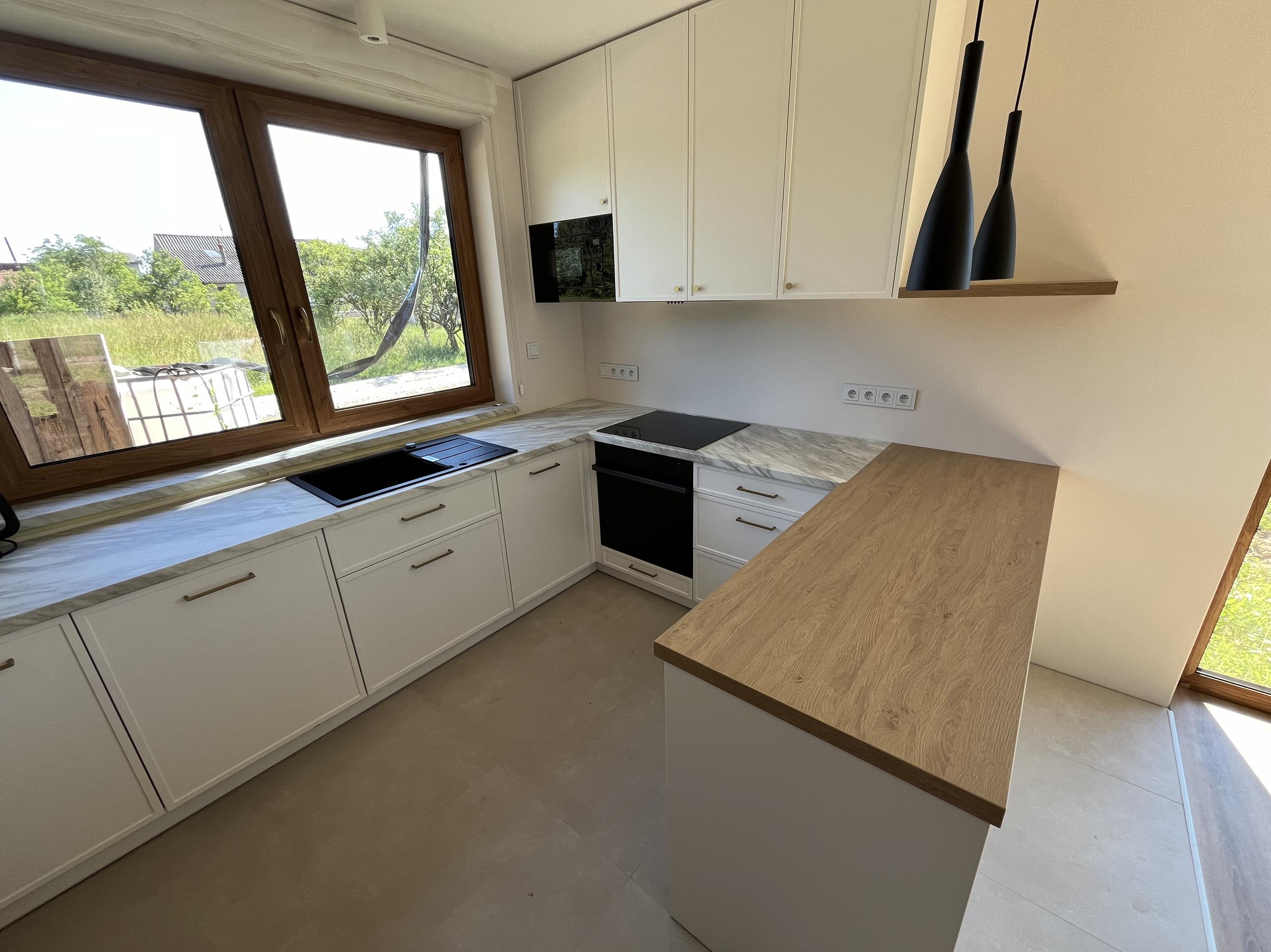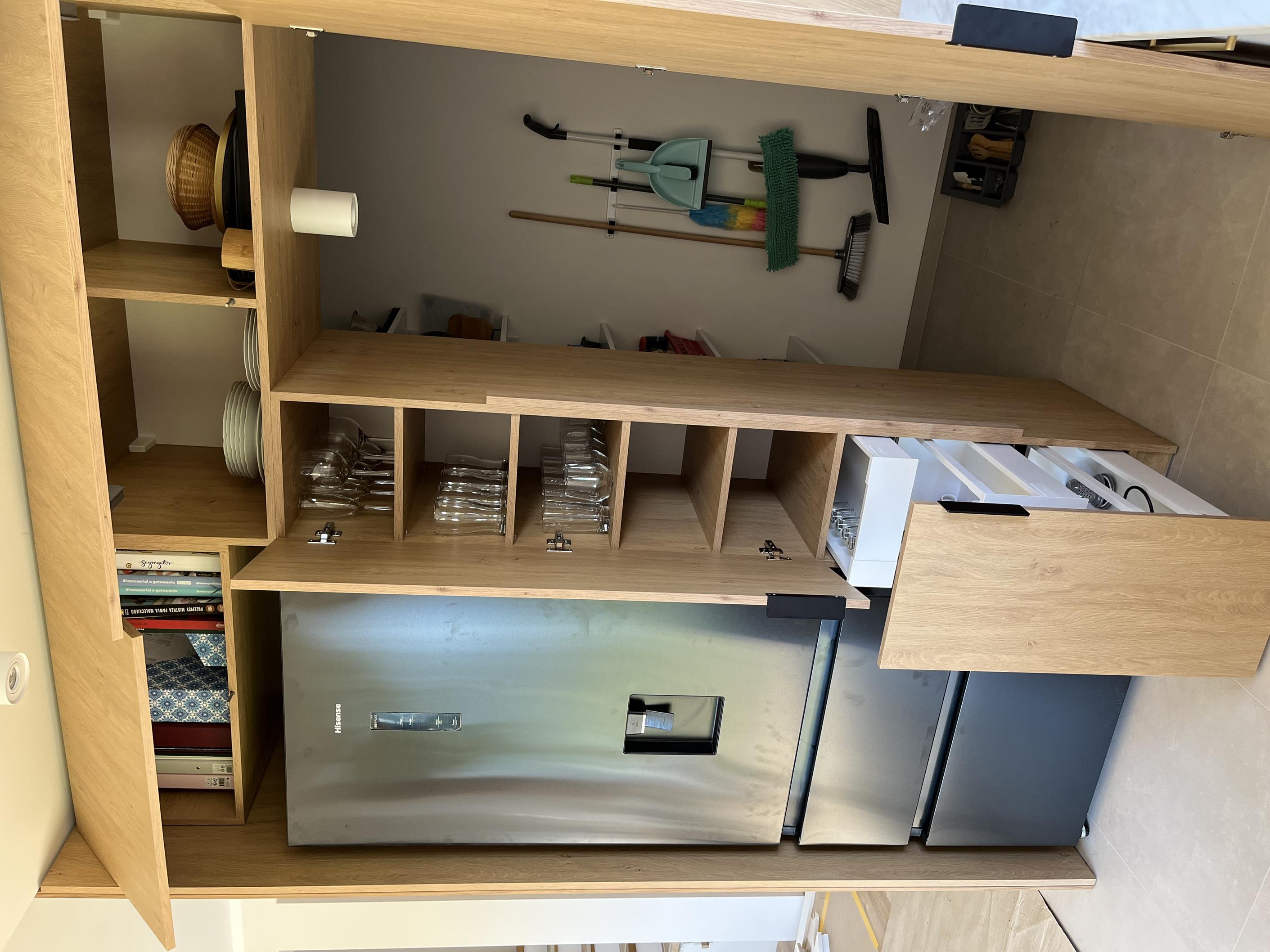 Wysoka zabudowa jest wykonana właśnie z tego dębu kamiennego natomiast pozostałe fronty są frezowane i lakierowane na biały mat.