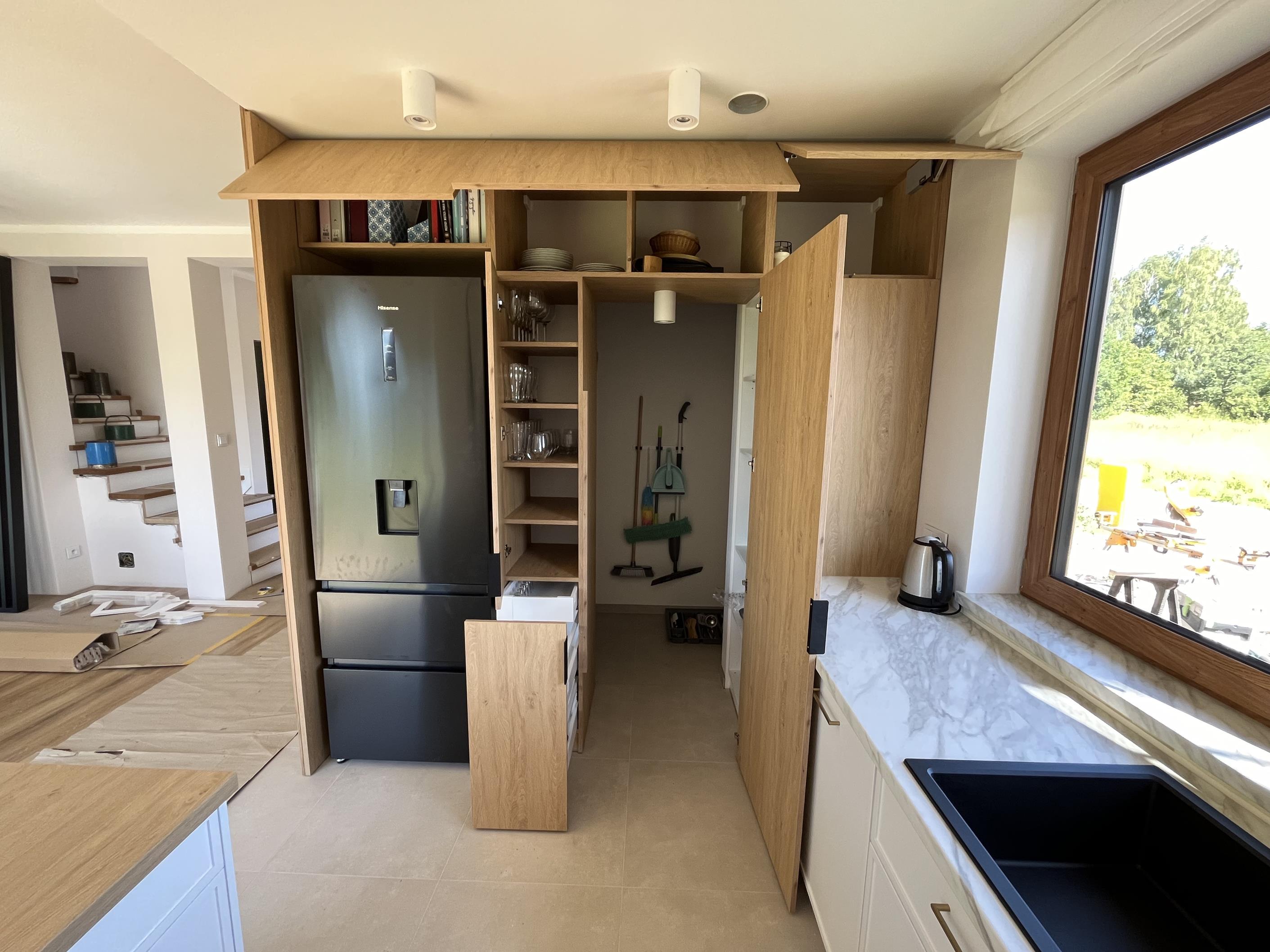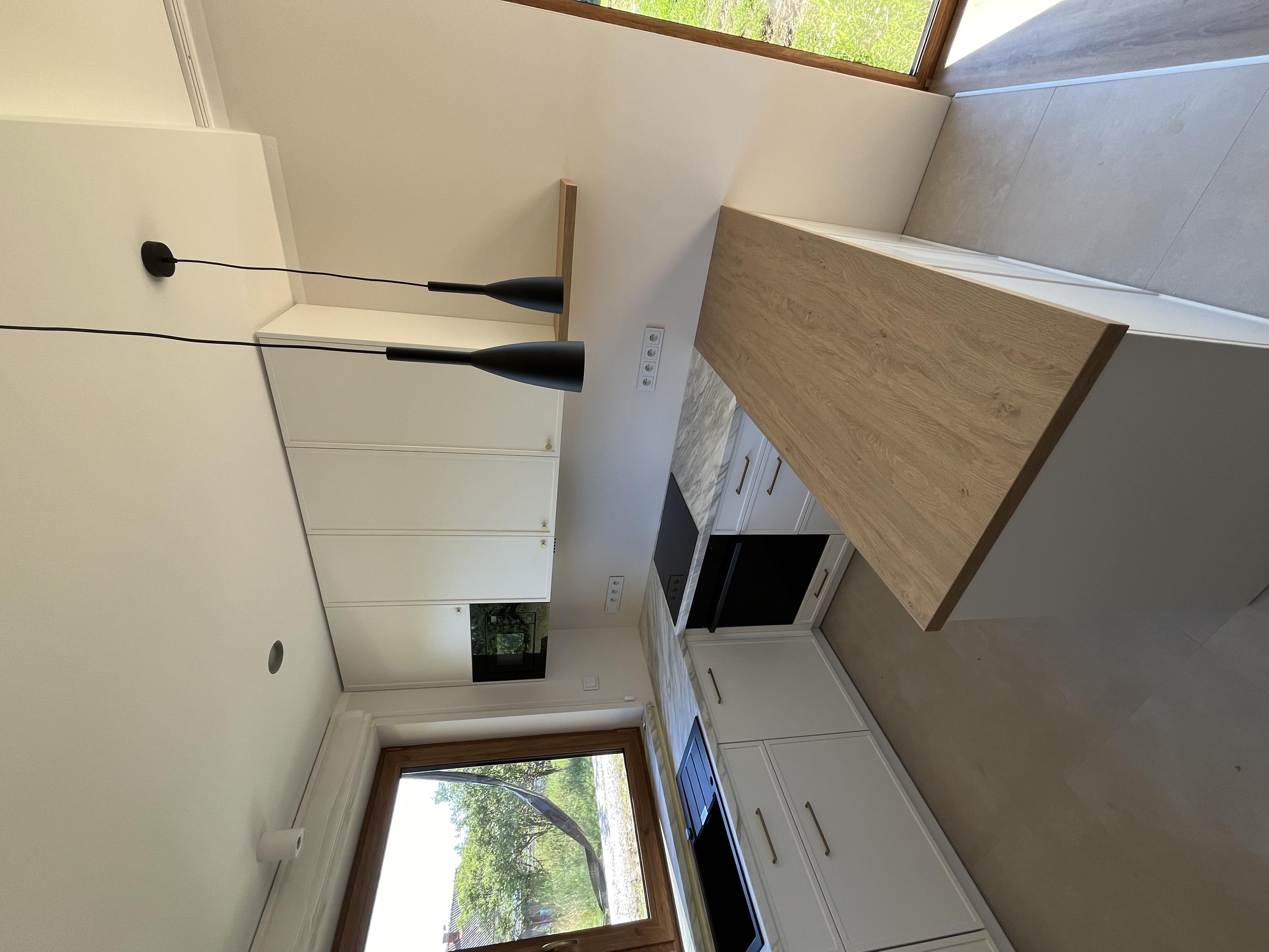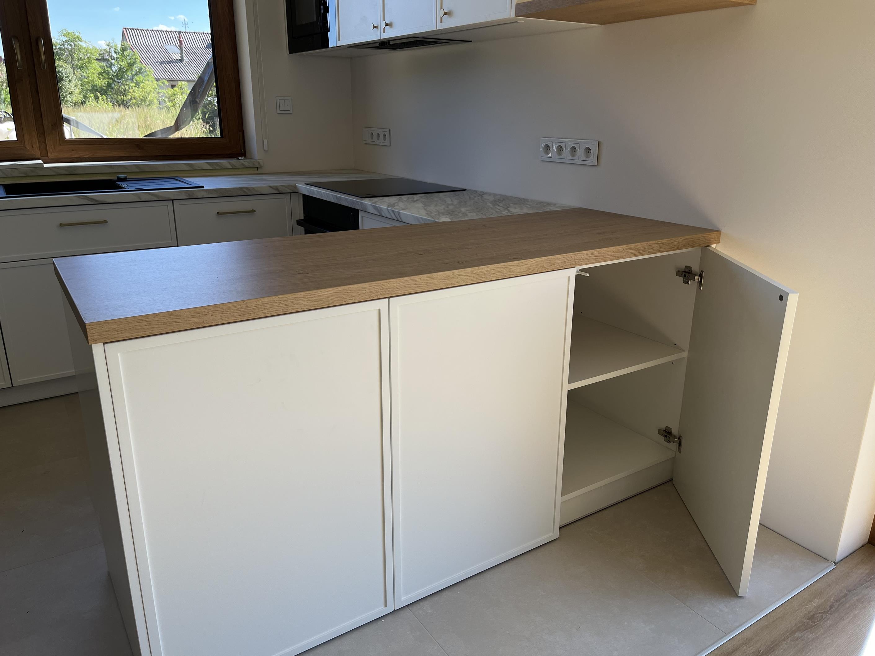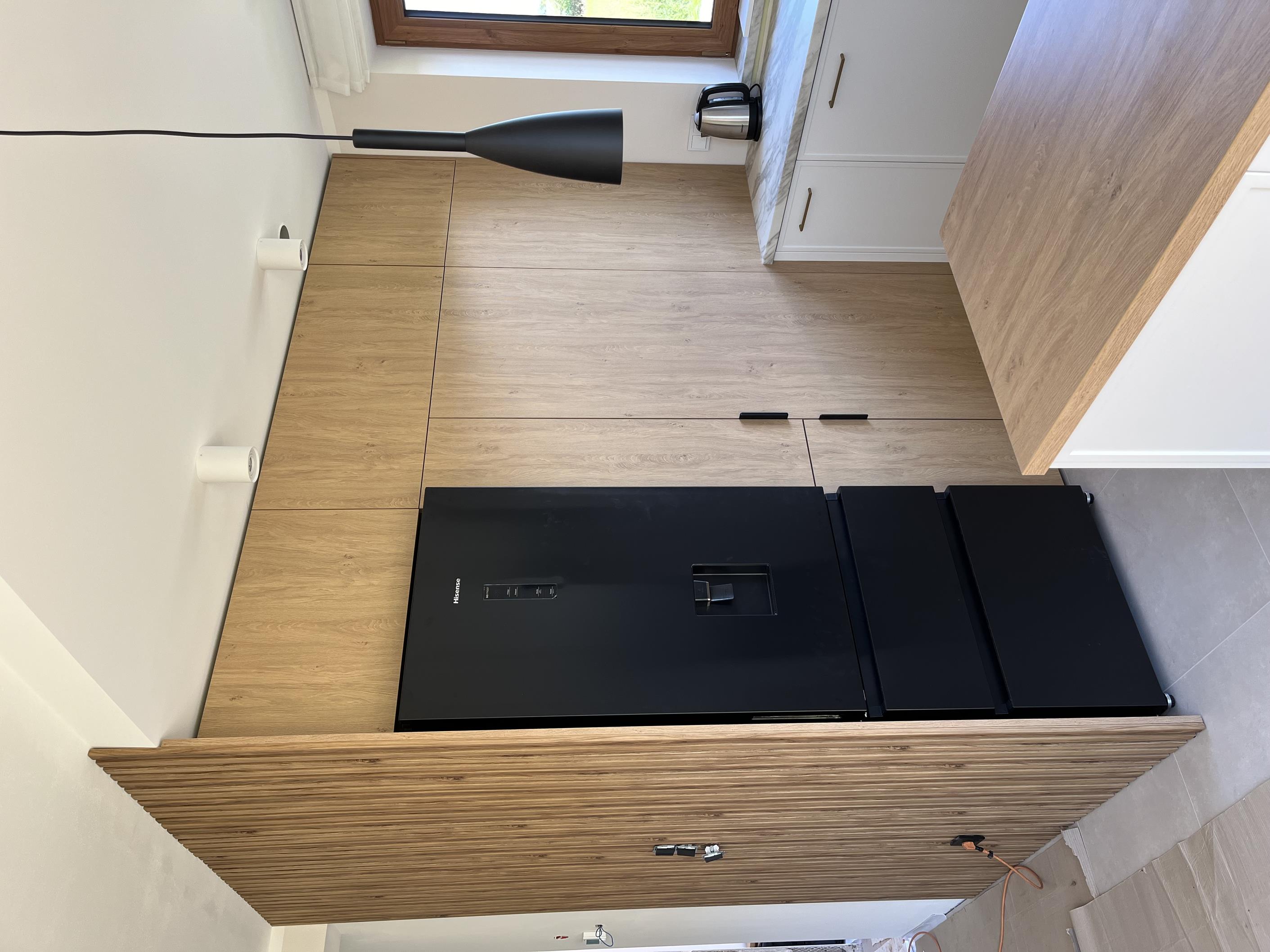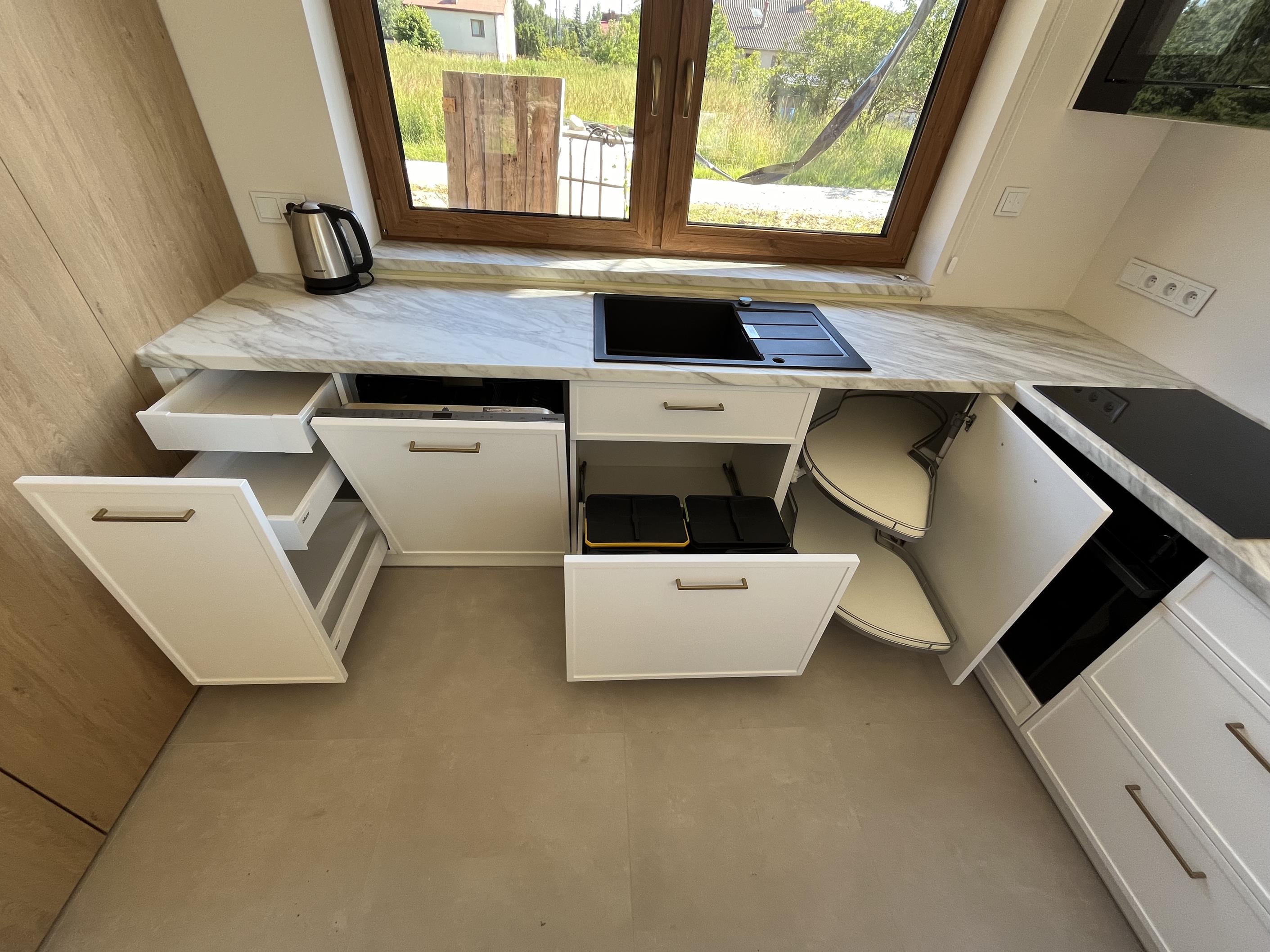 Wysoka zabudowa jest wykonana właśnie z tego dębu kamiennego natomiast pozostałe fronty są frezowane i lakierowane na biały mat.