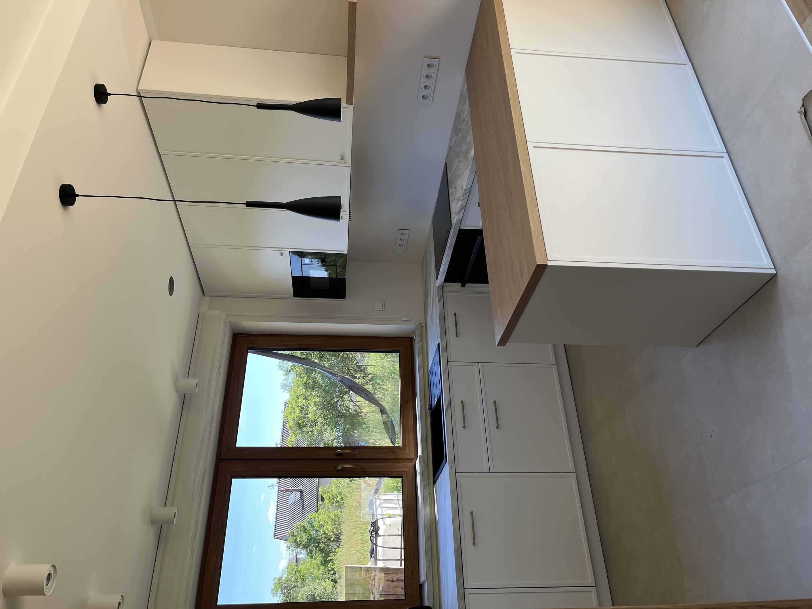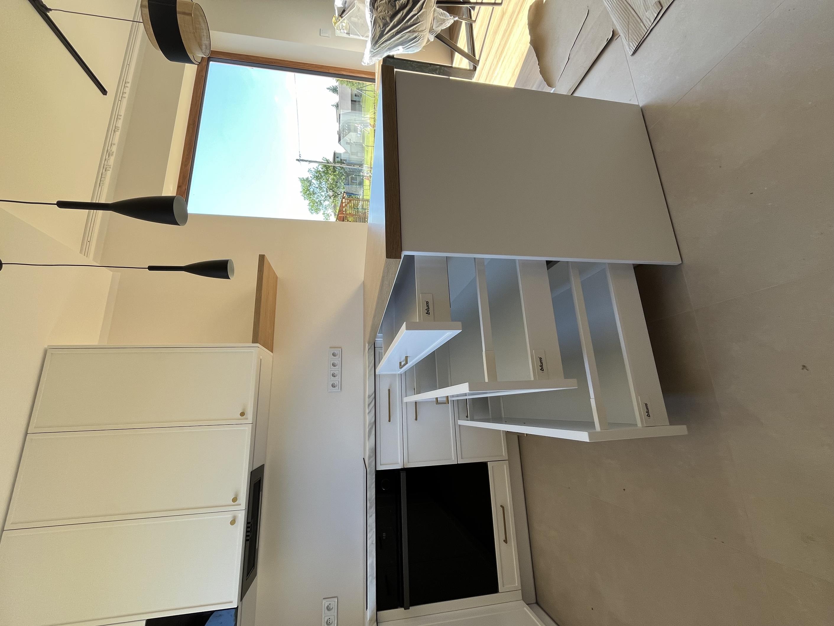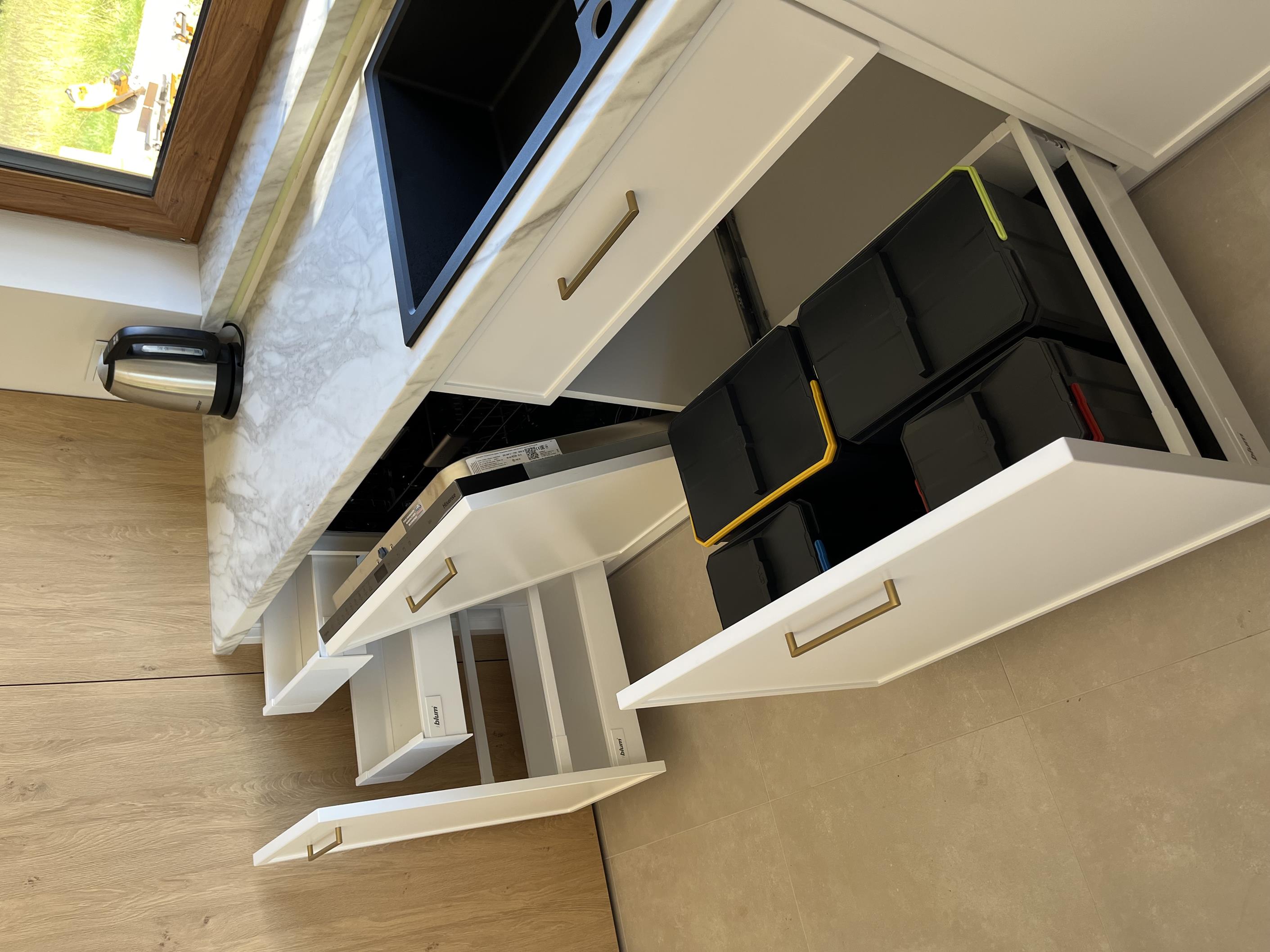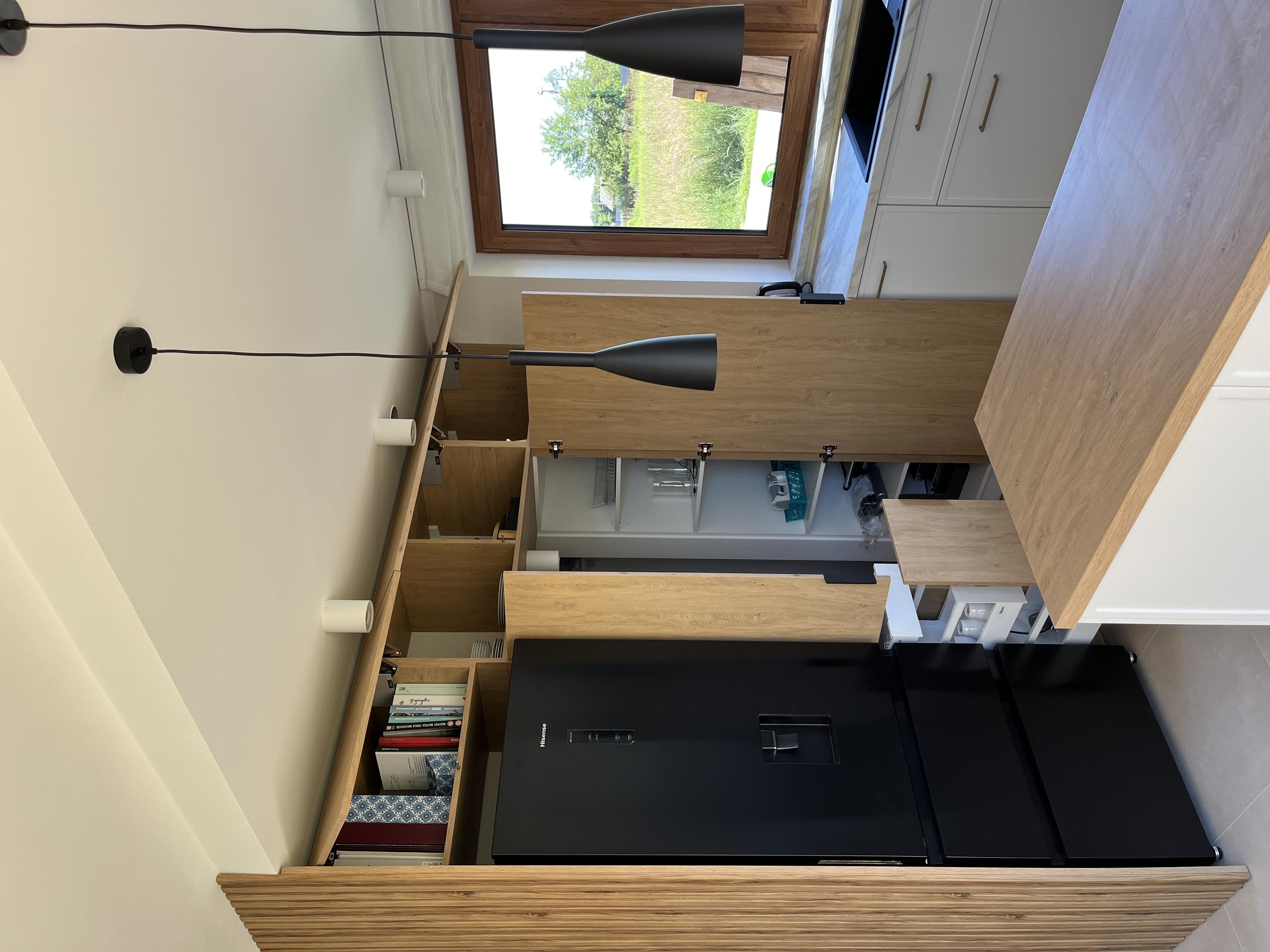 Wysoka zabudowa jest wykonana właśnie z tego dębu kamiennego natomiast pozostałe fronty są frezowane i lakierowane na biały mat.