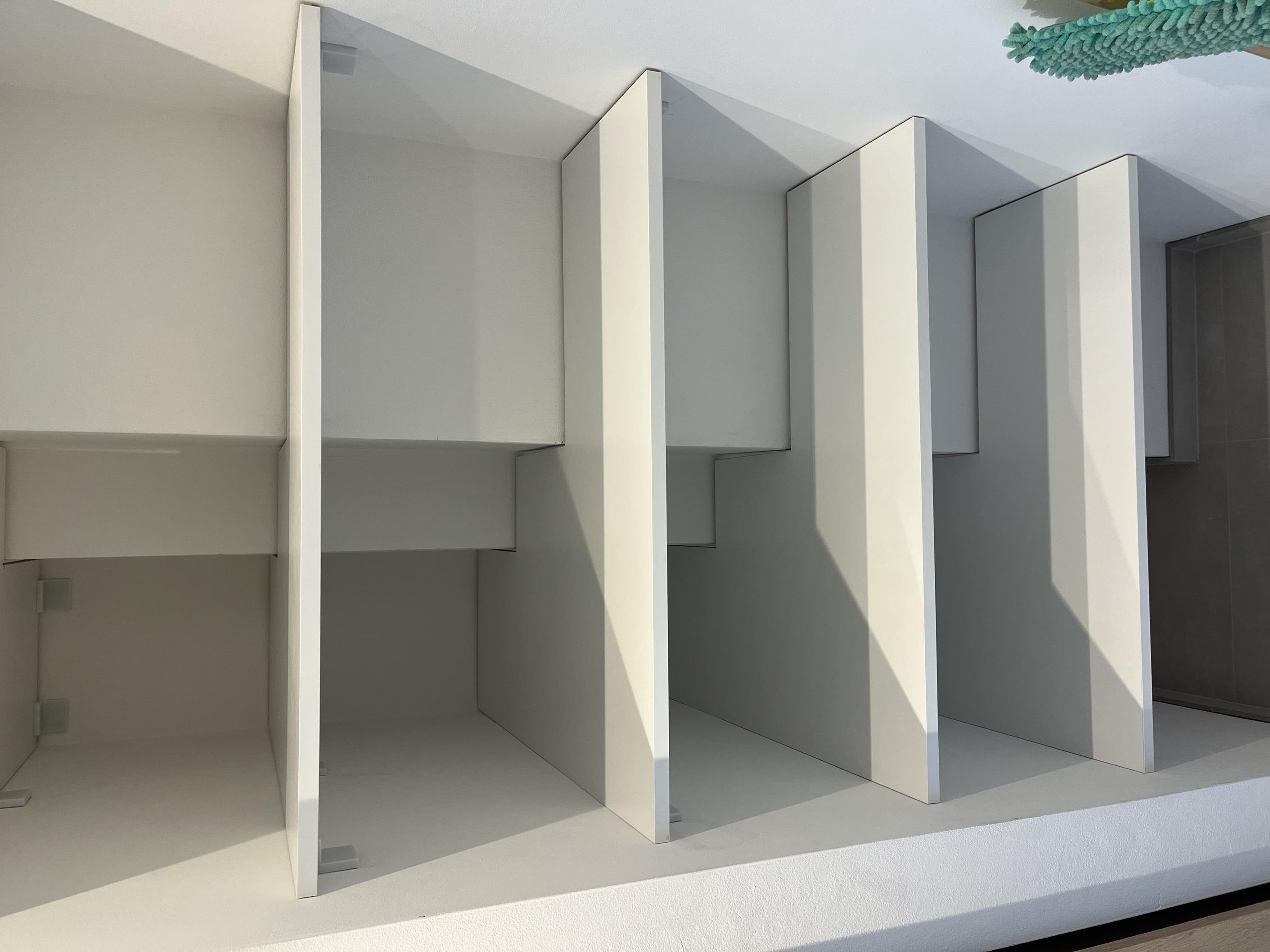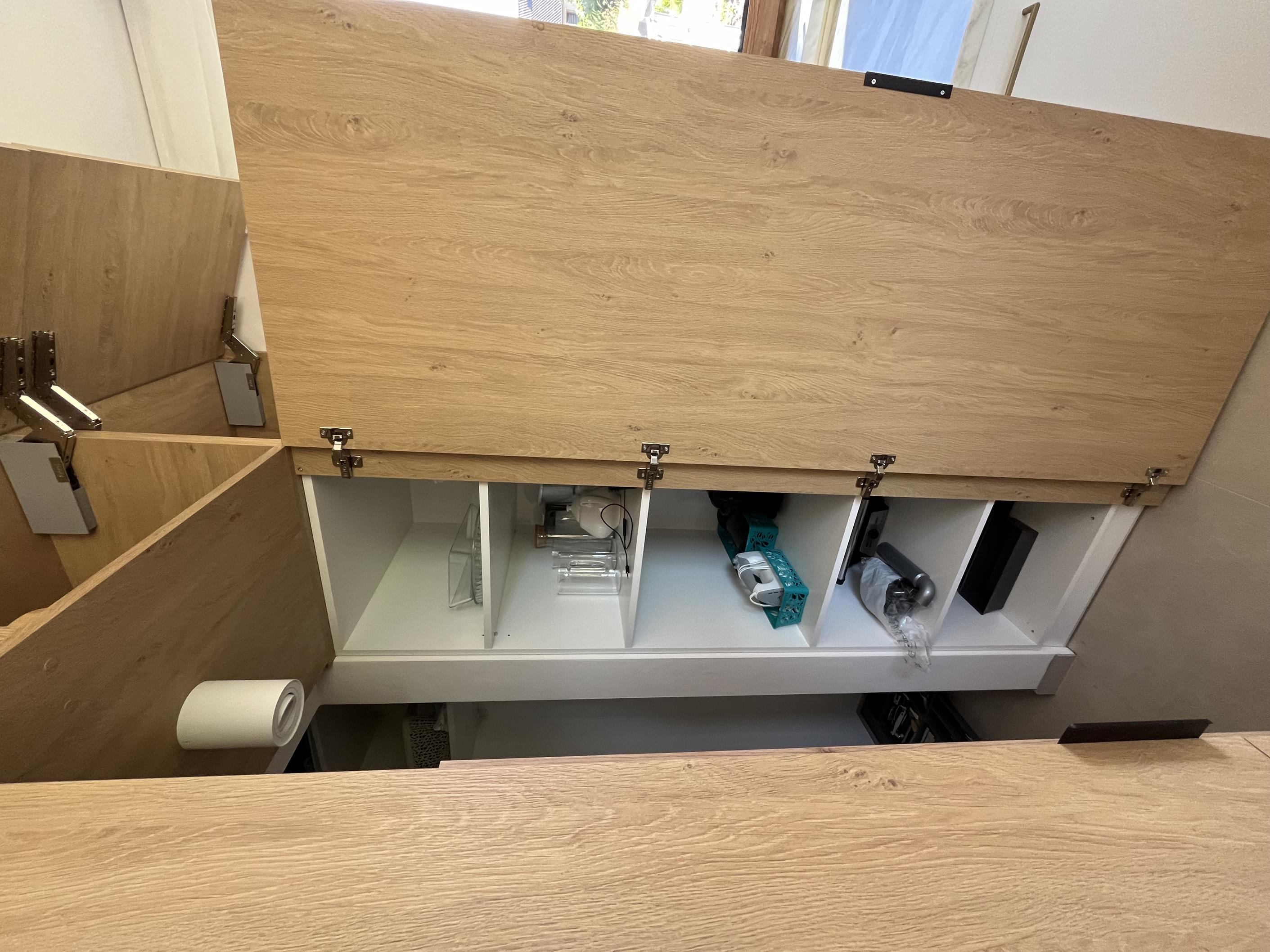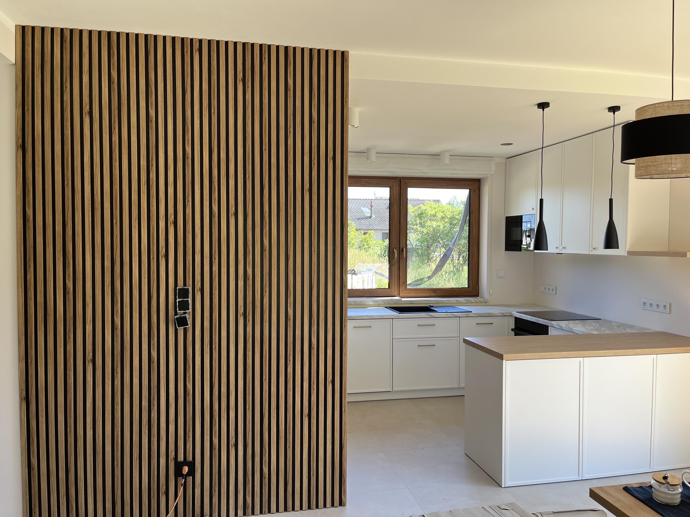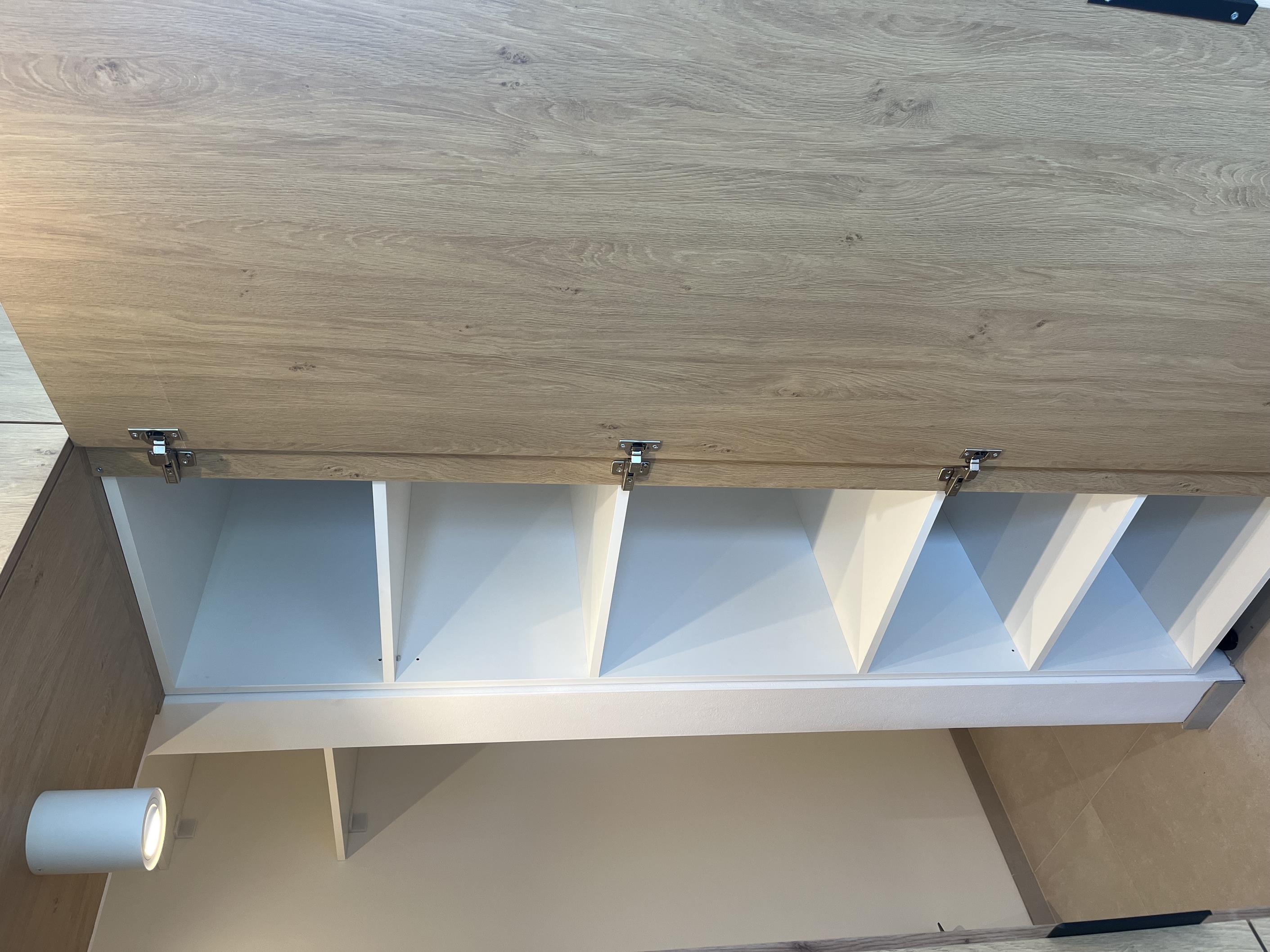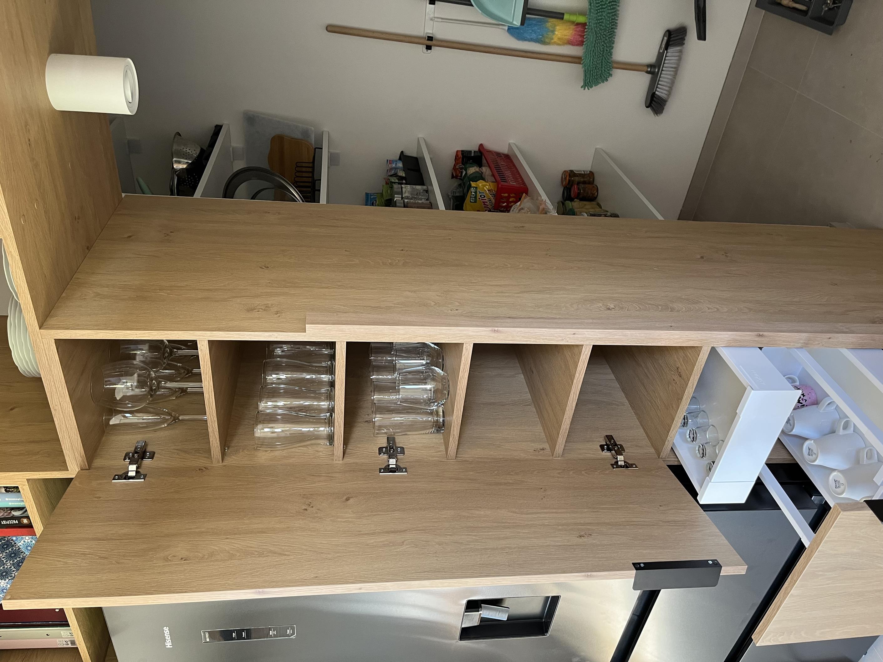 Wysoka zabudowa jest wykonana właśnie z tego dębu kamiennego natomiast pozostałe fronty są frezowane i lakierowane na biały mat.