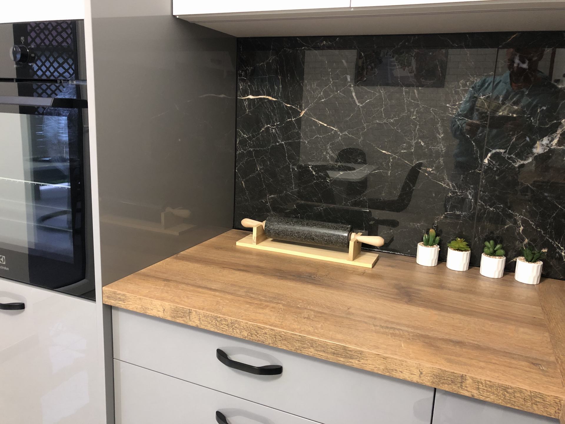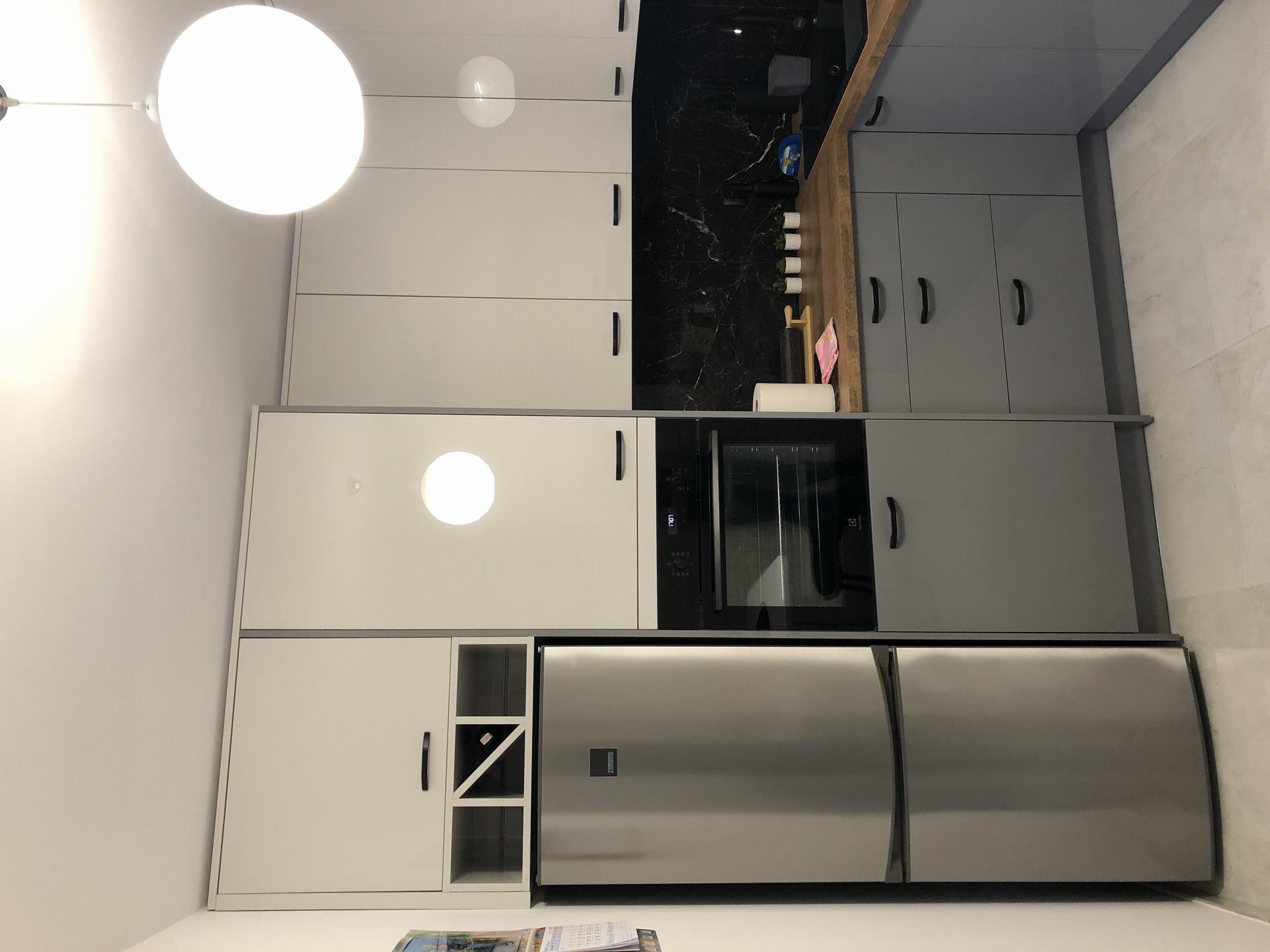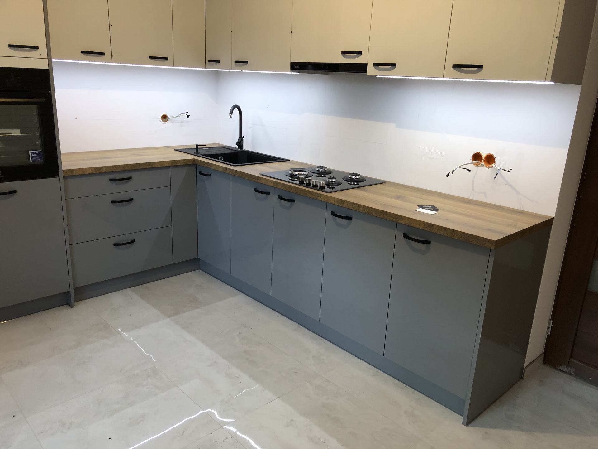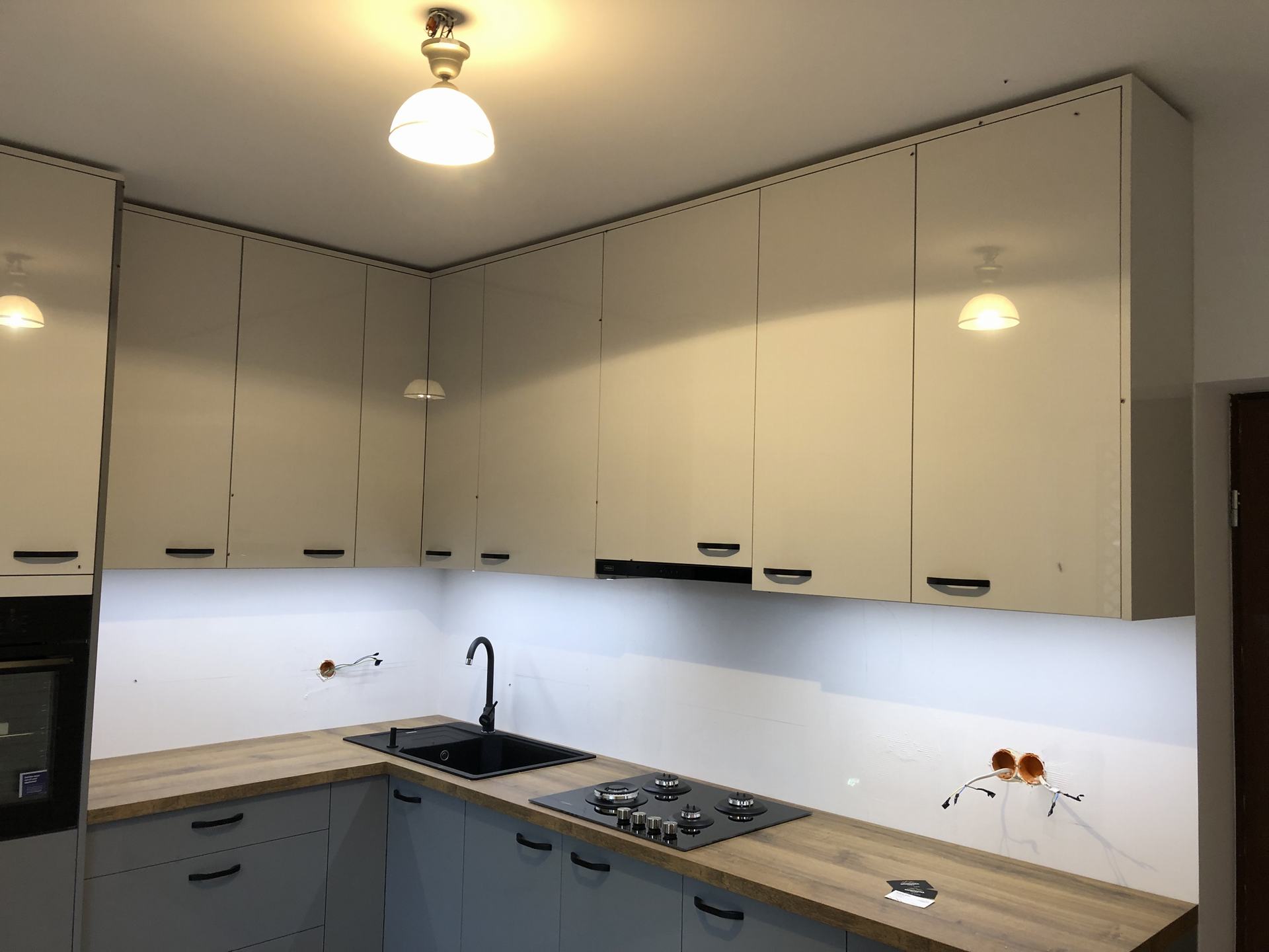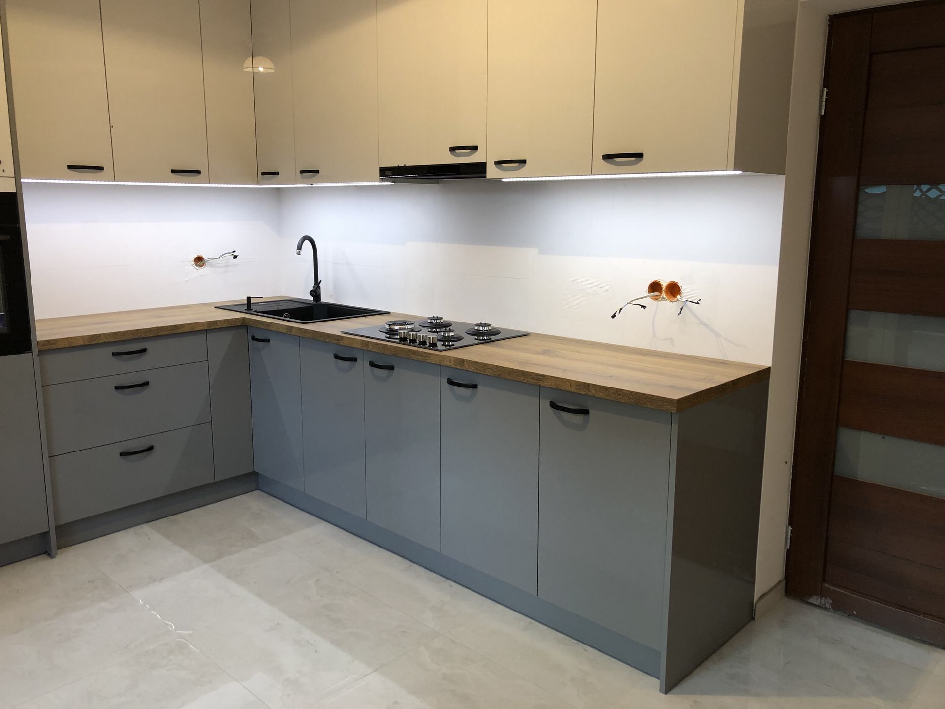 Jest to połączenie frontów akrylowych REHAU kolory Roccia 2101L, Nebbia 1910L w wysokim połysku oraz blat Egger Dąb Sherman koniakowy brązowy. Proszę zwrócić uwagę na dość nietypową zabudowę piekarnika nad zmywarką.