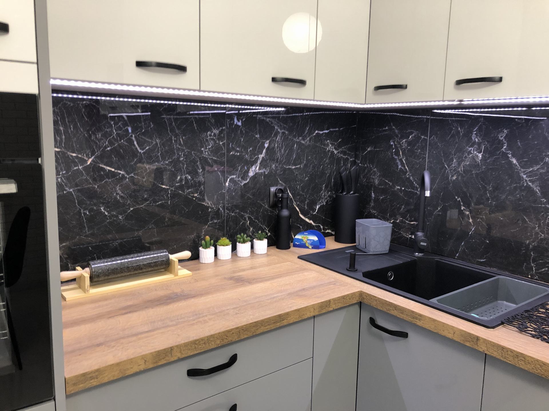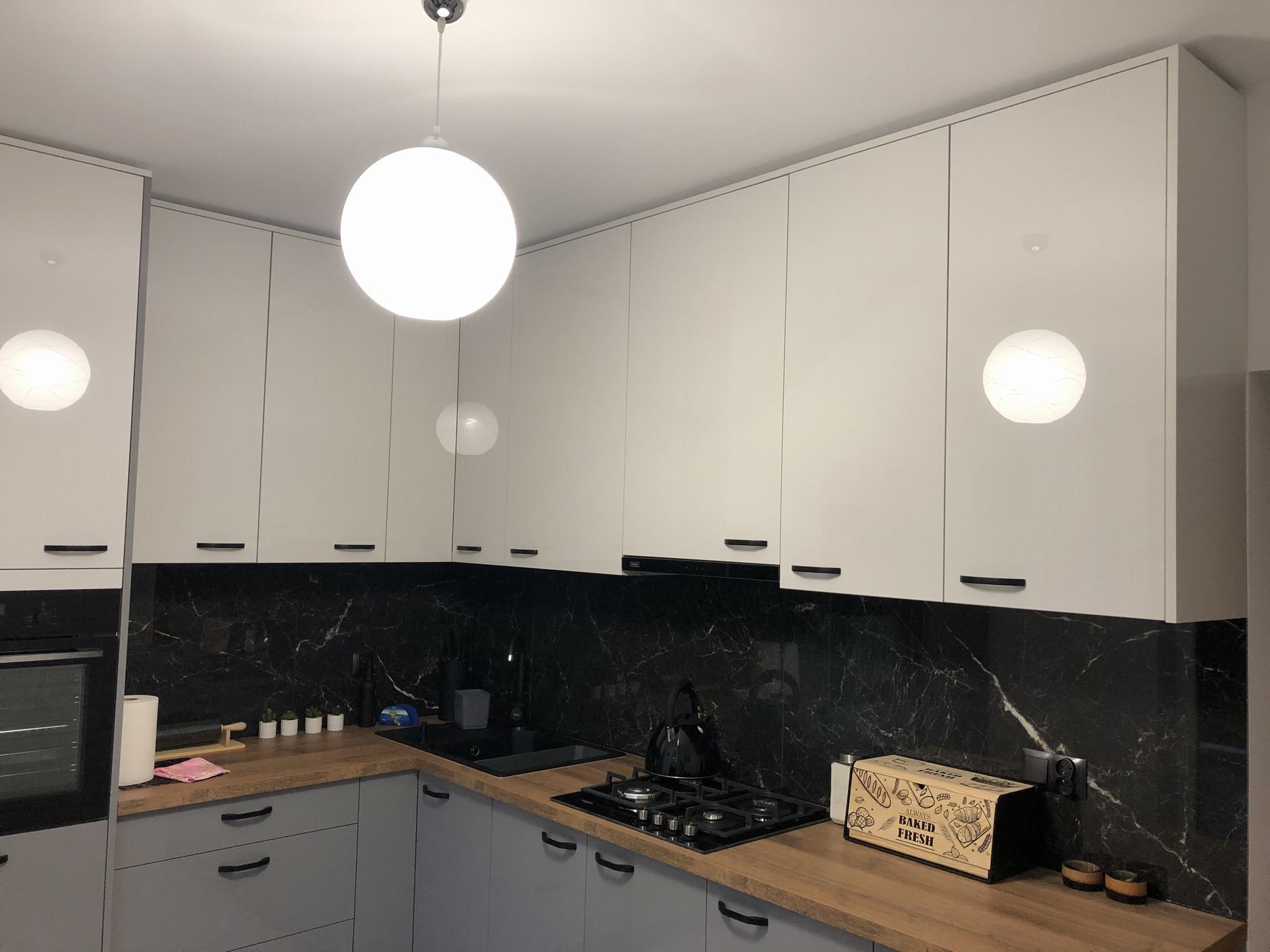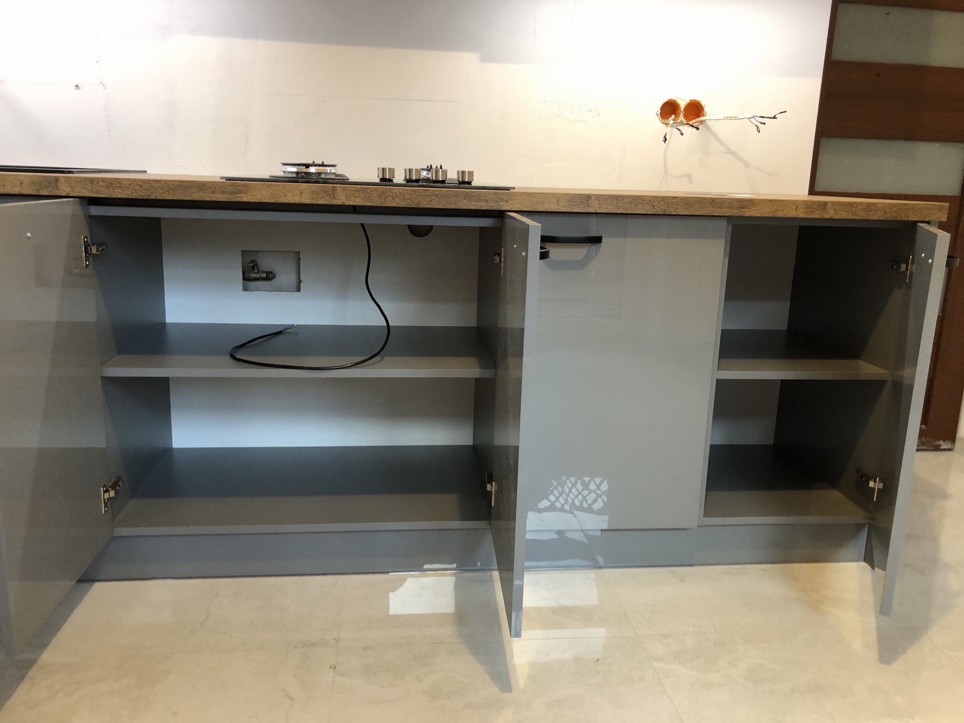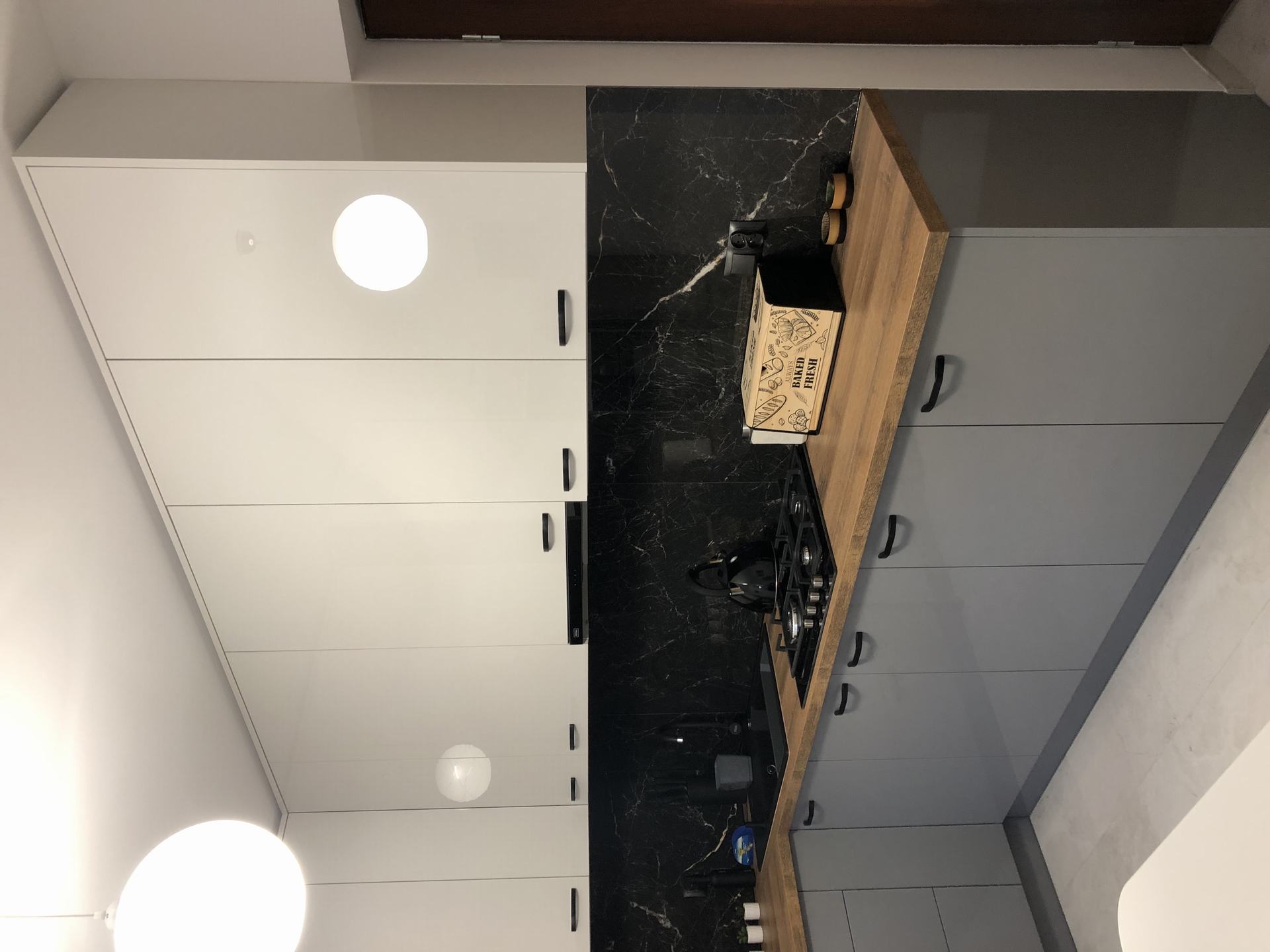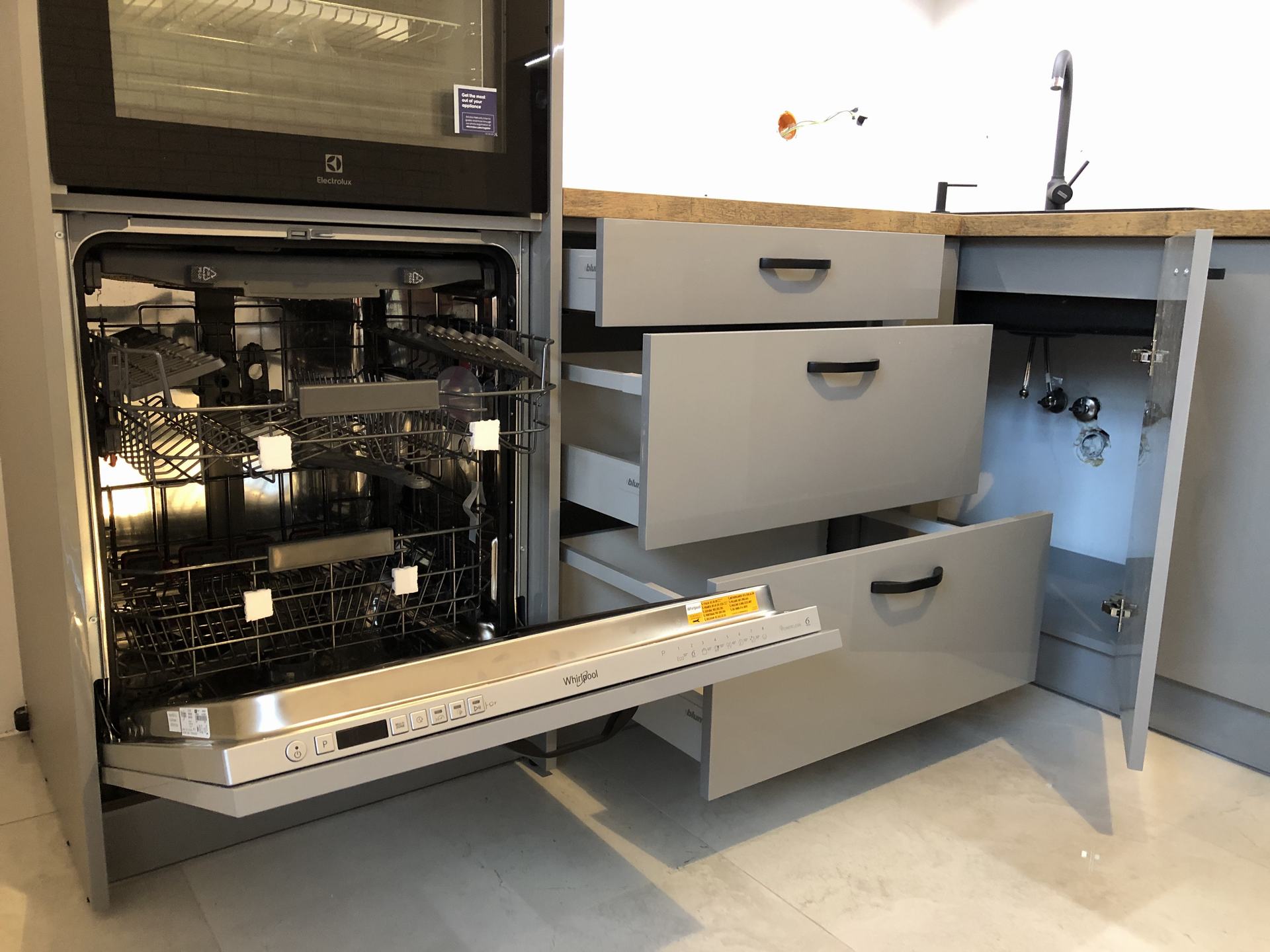 Jest to połączenie frontów akrylowych REHAU kolory Roccia 2101L, Nebbia 1910L w wysokim połysku oraz blat Egger Dąb Sherman koniakowy brązowy. Proszę zwrócić uwagę na dość nietypową zabudowę piekarnika nad zmywarką.