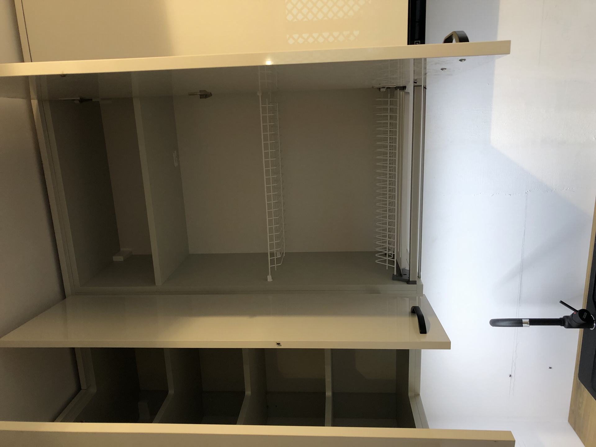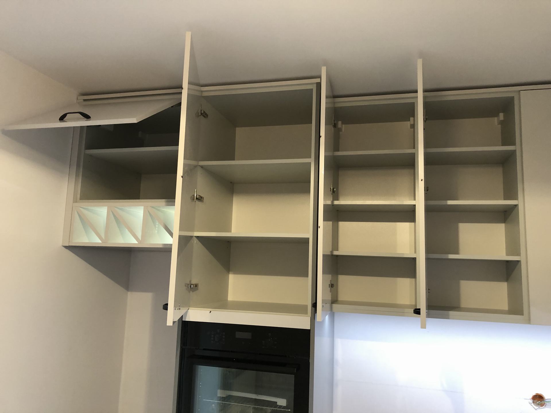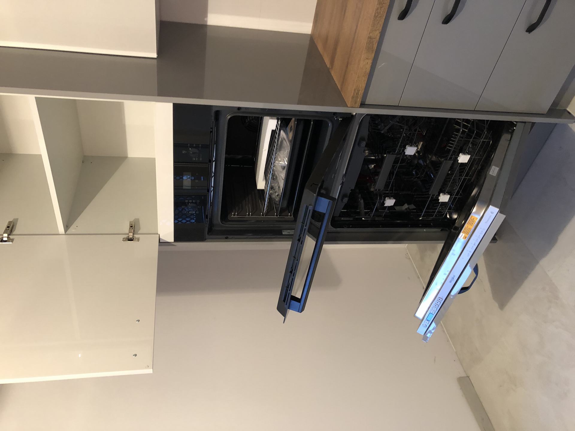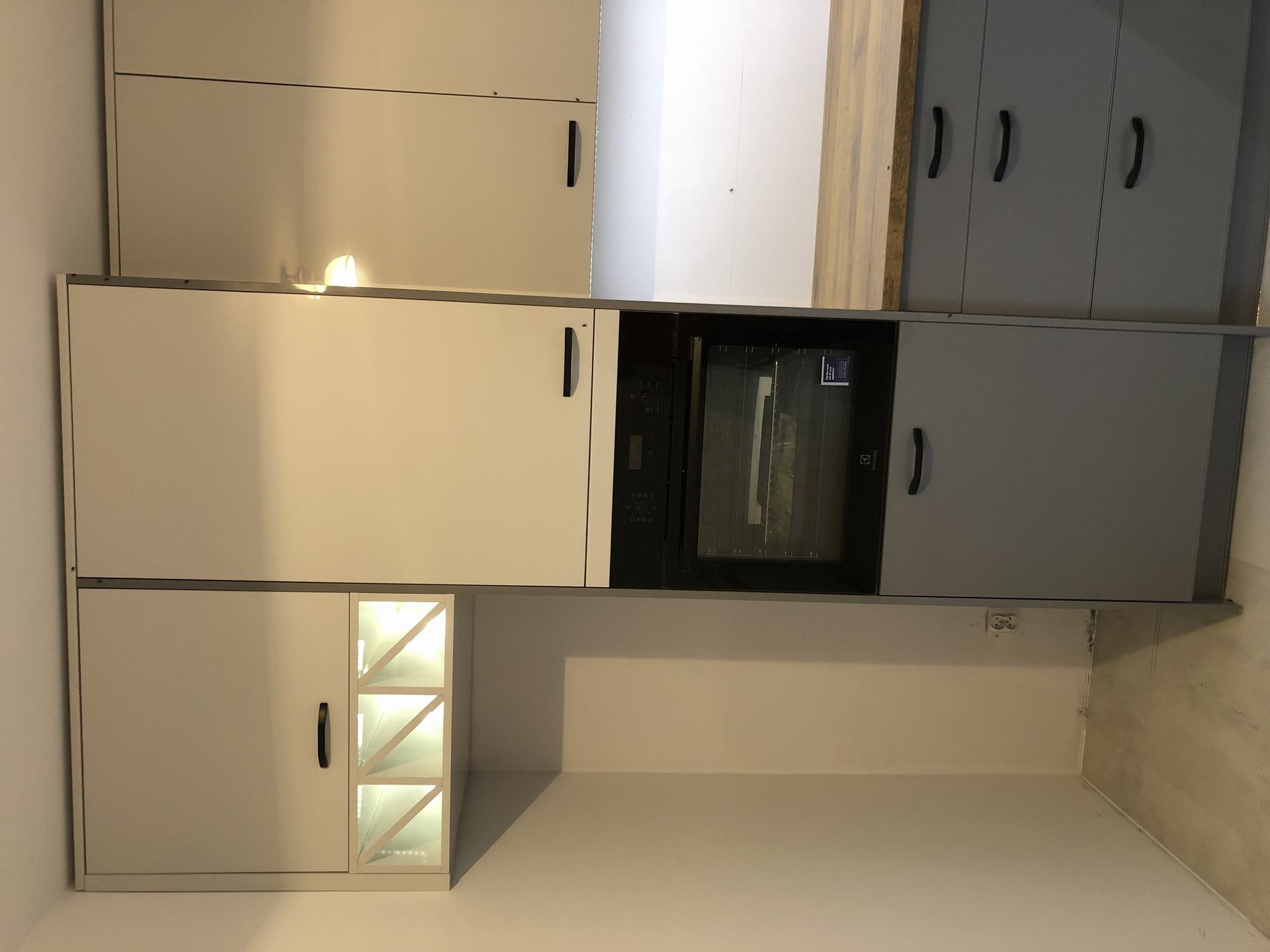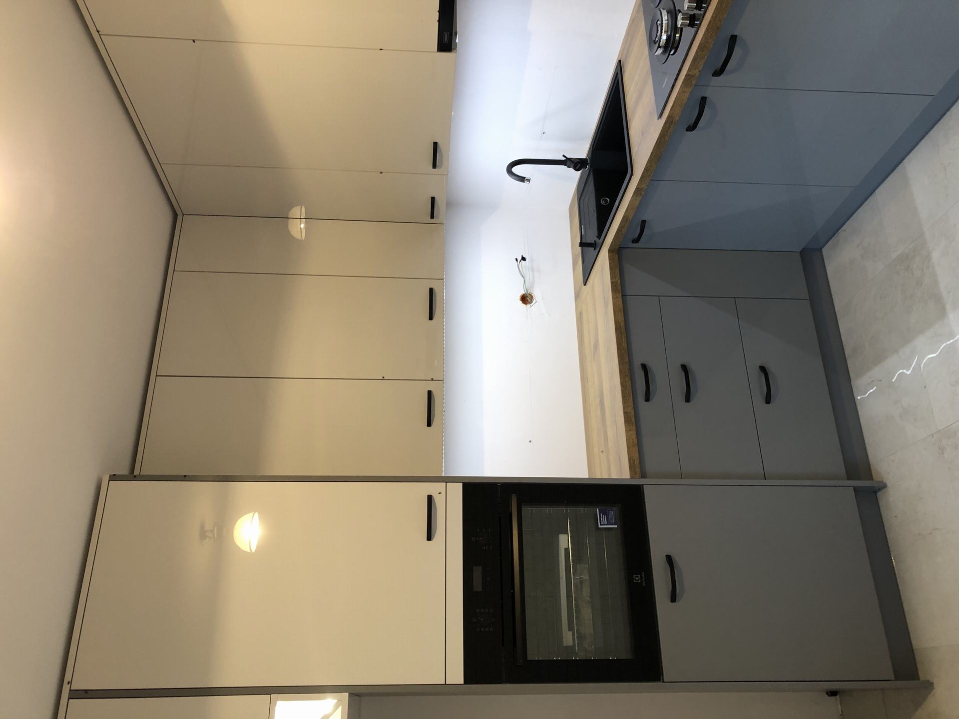 Jest to połączenie frontów akrylowych REHAU kolory Roccia 2101L, Nebbia 1910L w wysokim połysku oraz blat Egger Dąb Sherman koniakowy brązowy. Proszę zwrócić uwagę na dość nietypową zabudowę piekarnika nad zmywarką.