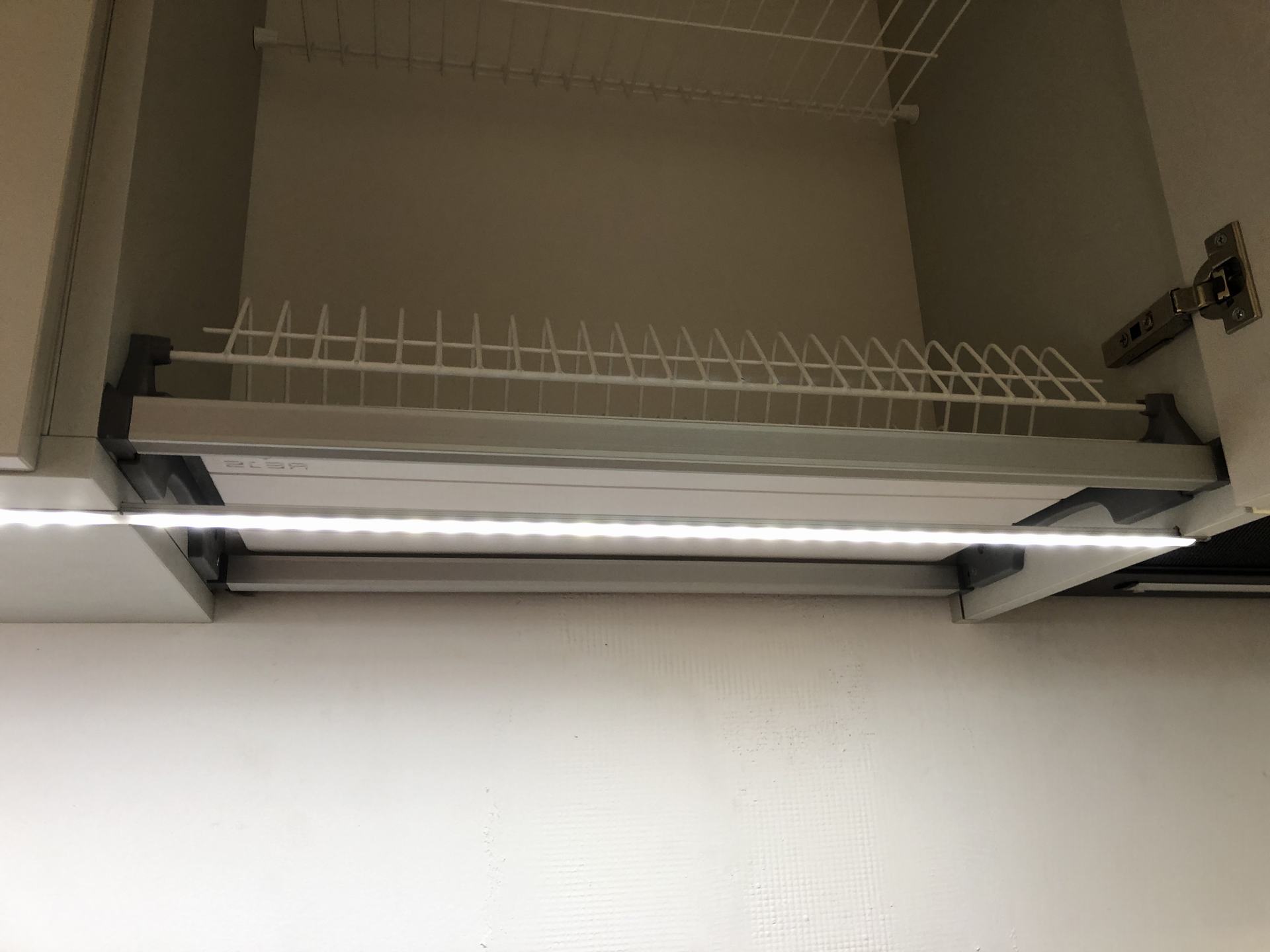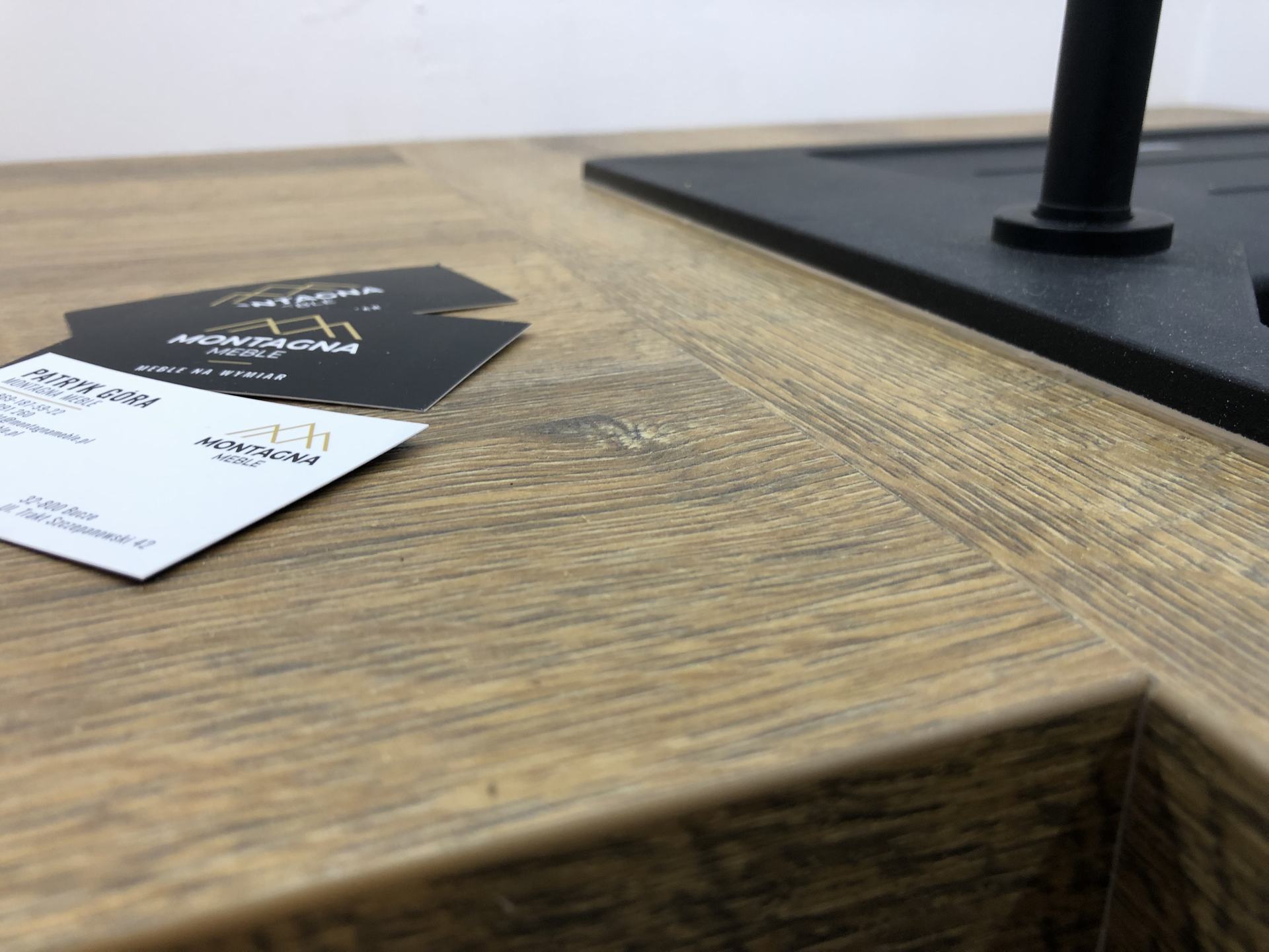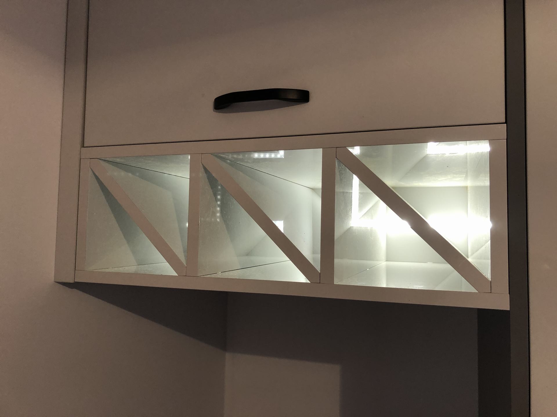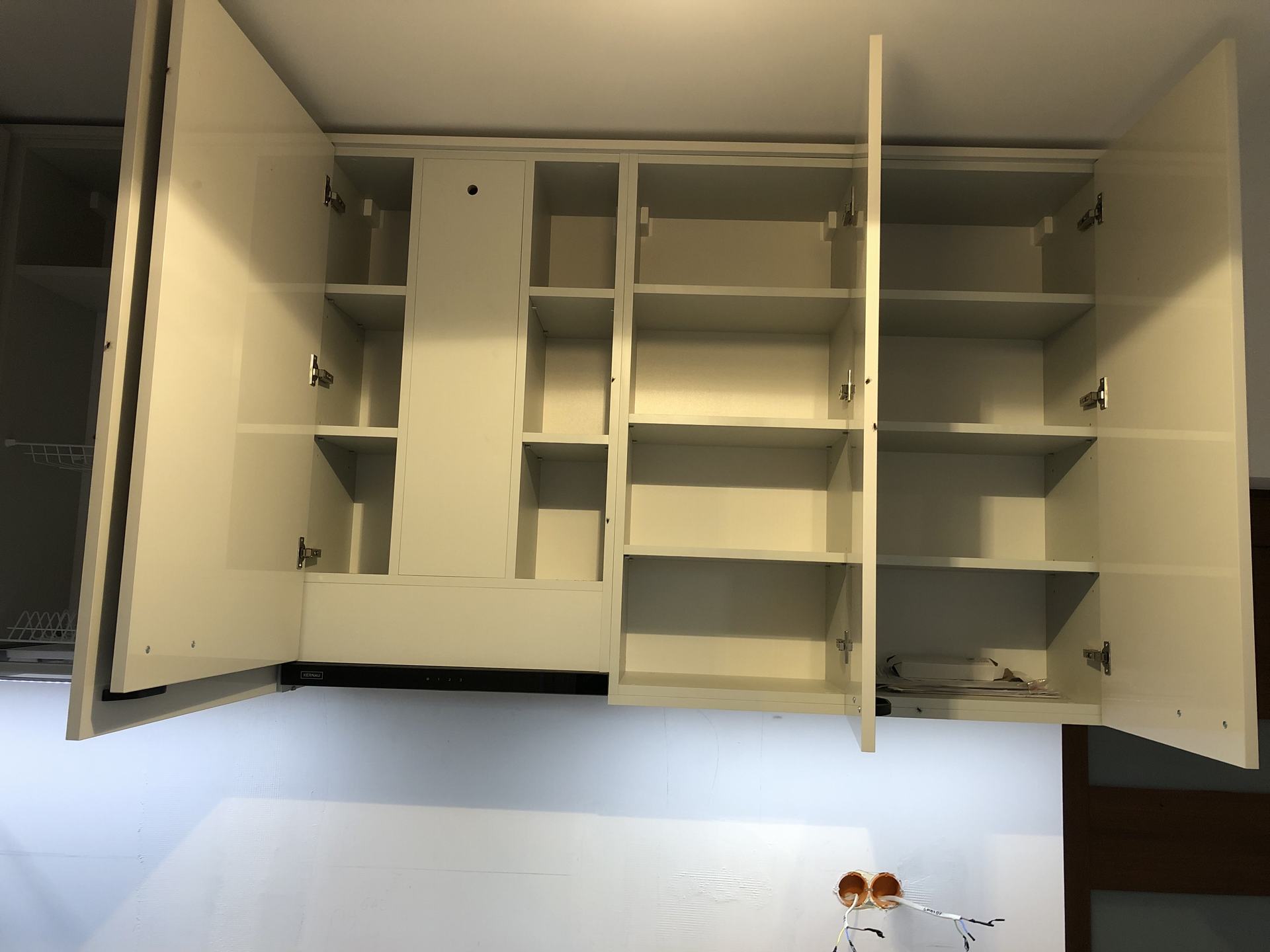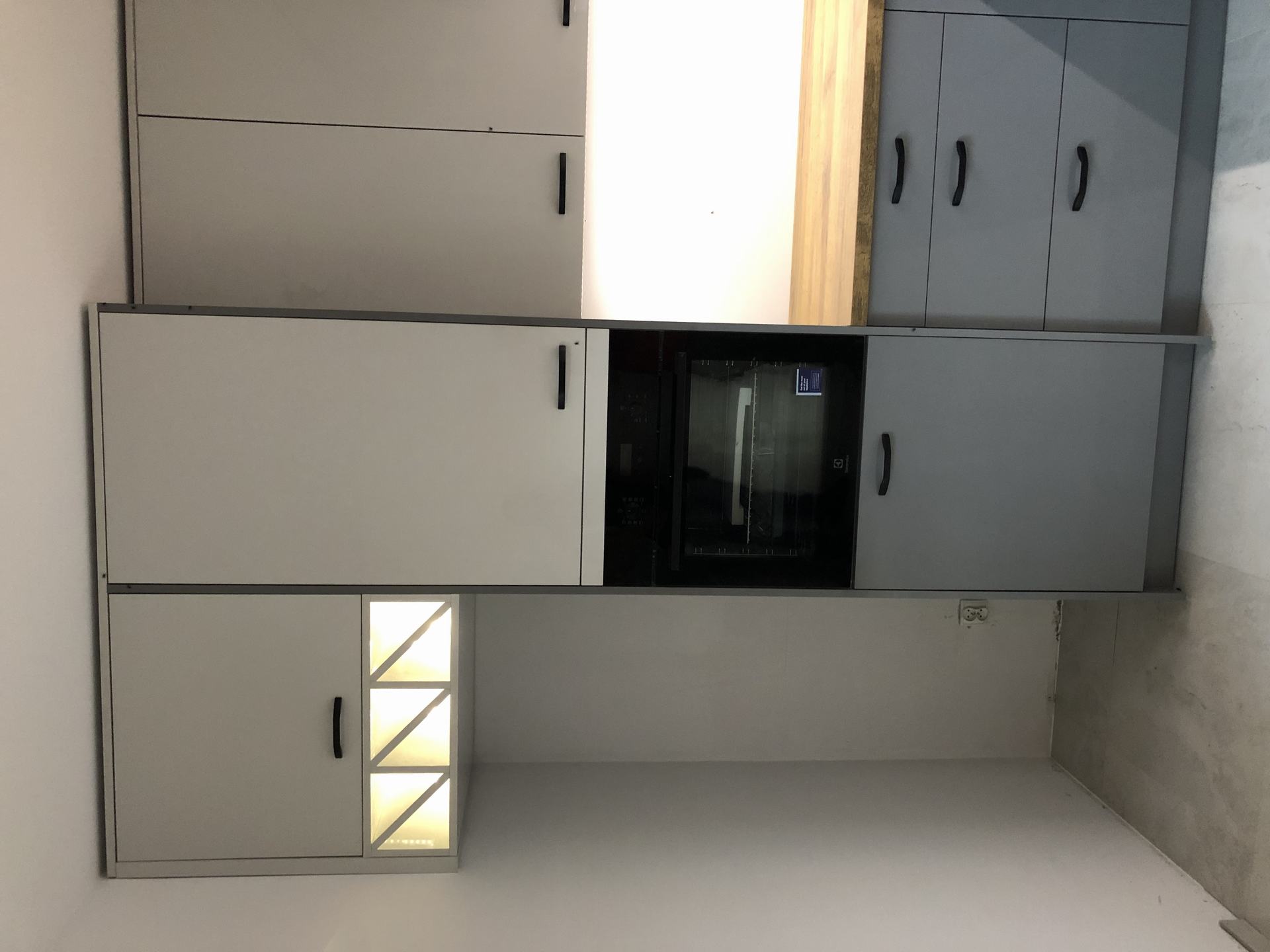 Jest to połączenie frontów akrylowych REHAU kolory Roccia 2101L, Nebbia 1910L w wysokim połysku oraz blat Egger Dąb Sherman koniakowy brązowy. Proszę zwrócić uwagę na dość nietypową zabudowę piekarnika nad zmywarką.
