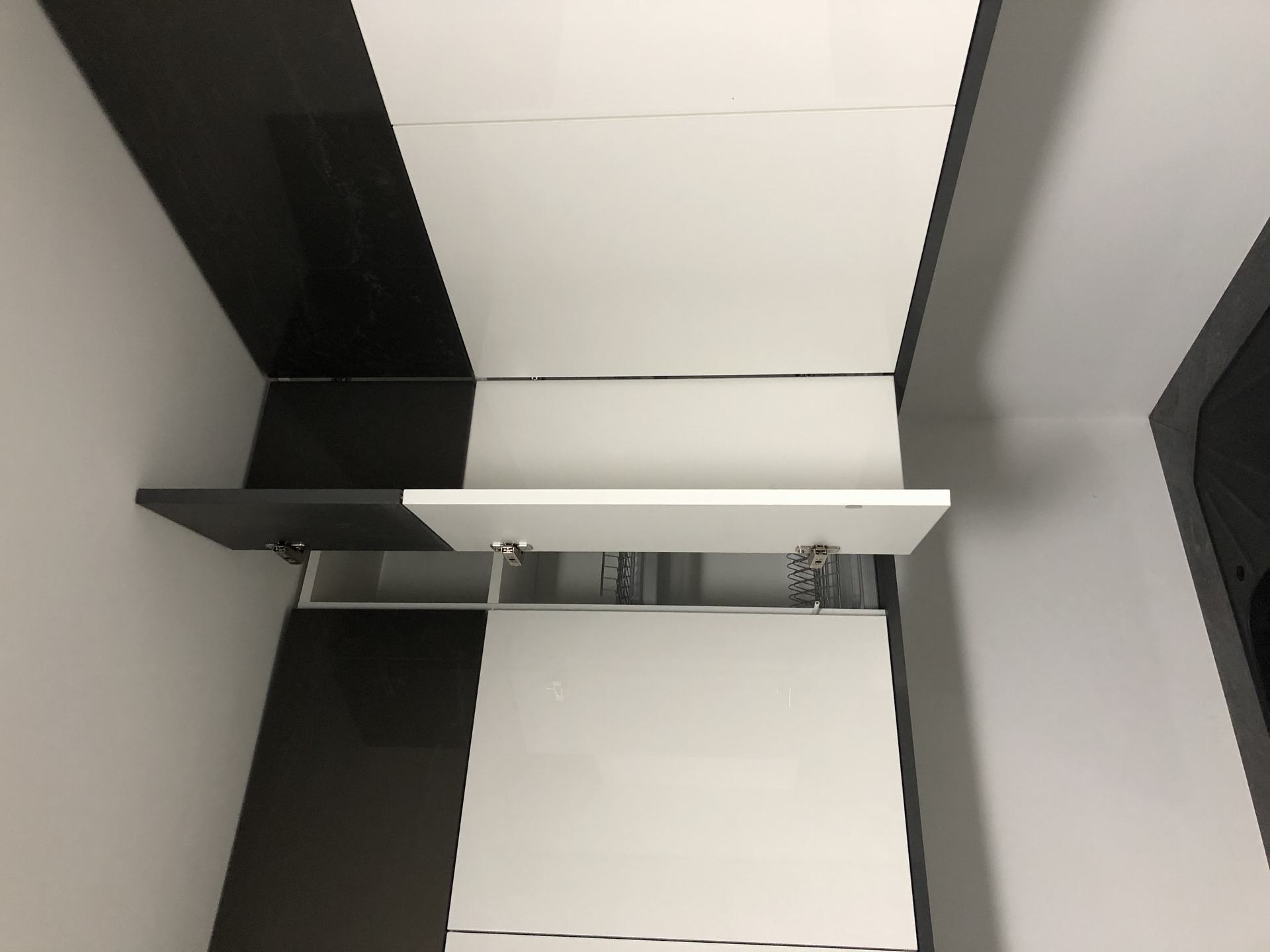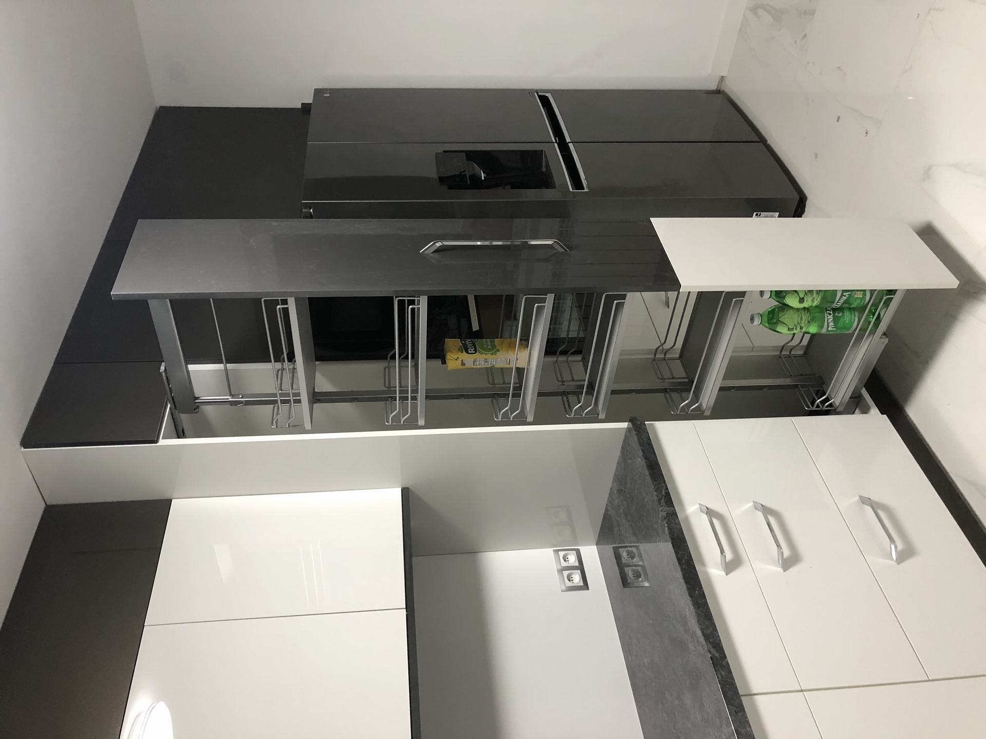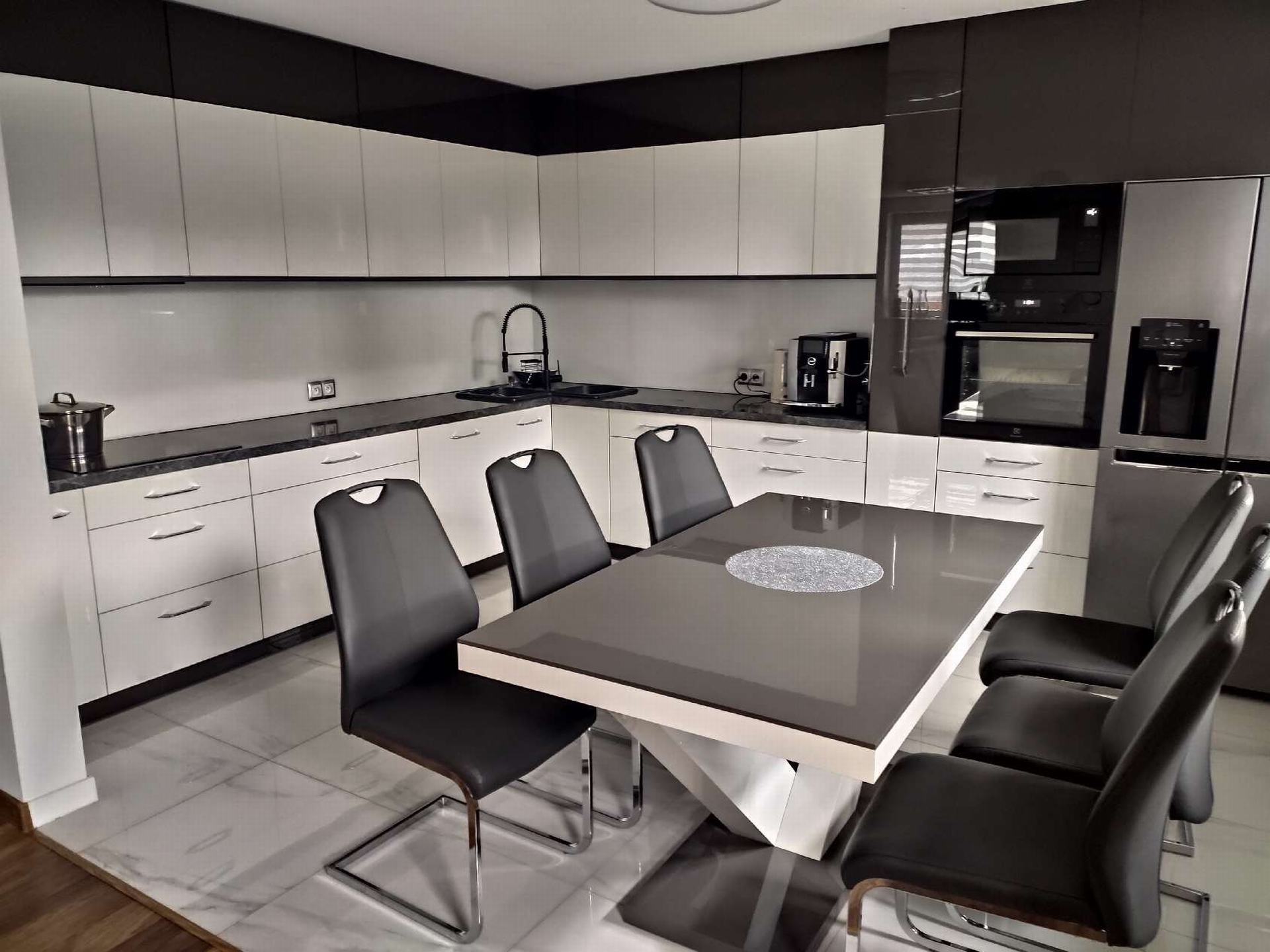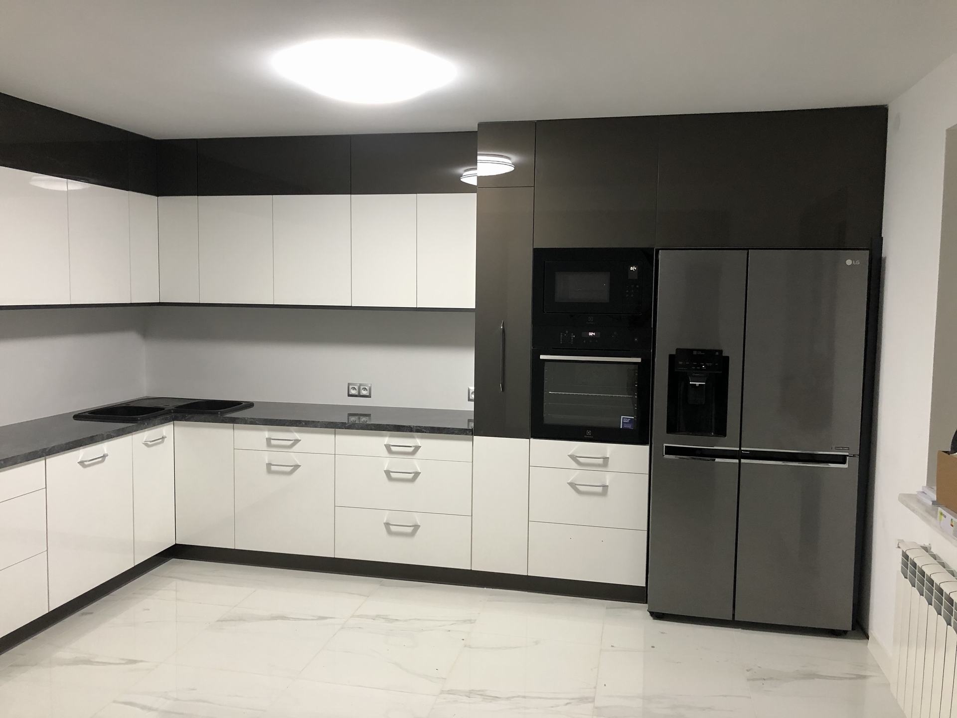 Starając się sprostać wymaganiom naszych Inwestorów, szukamy jak najbardziej trafnych rozwiązań. Nie zawsze są one najłatwiejsze w wykonaniu, ale za to ułatwiają prace czy poruszanie się w kuchni. W tym projekcie zastosowaliśmy szafkę narożną z ociekaczem. Życzeniem Ani i Edmunda było zainstalowanie zlewozmywaka narożnego a nad nim szafkę właśnie z ociekaczem narożnym. Udało się spełnić to oczekiwanie.